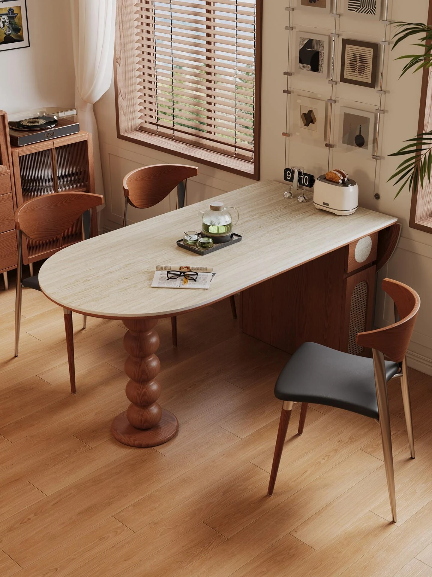 フランス風レトロデザインの洞石岩板エレガントな折りたたみ式オーバルダイニングテーブル!中古スタイルの小型住宅にぴったりな高級感溢れる無垢材製、食事を楽しむための理想的な選択。