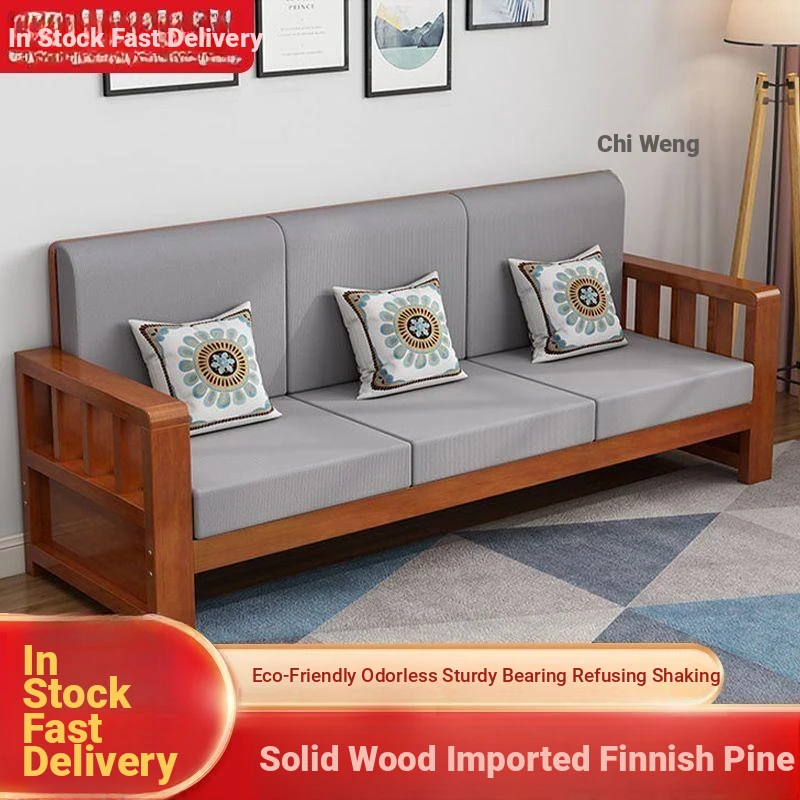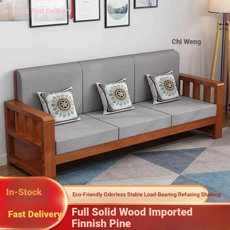 Stylish Solid Wood Sofa Set - New Chinese Style for Small Living Rooms, Space-Saving Three-Seater, Minimalist and Affordable Natural Wood Design