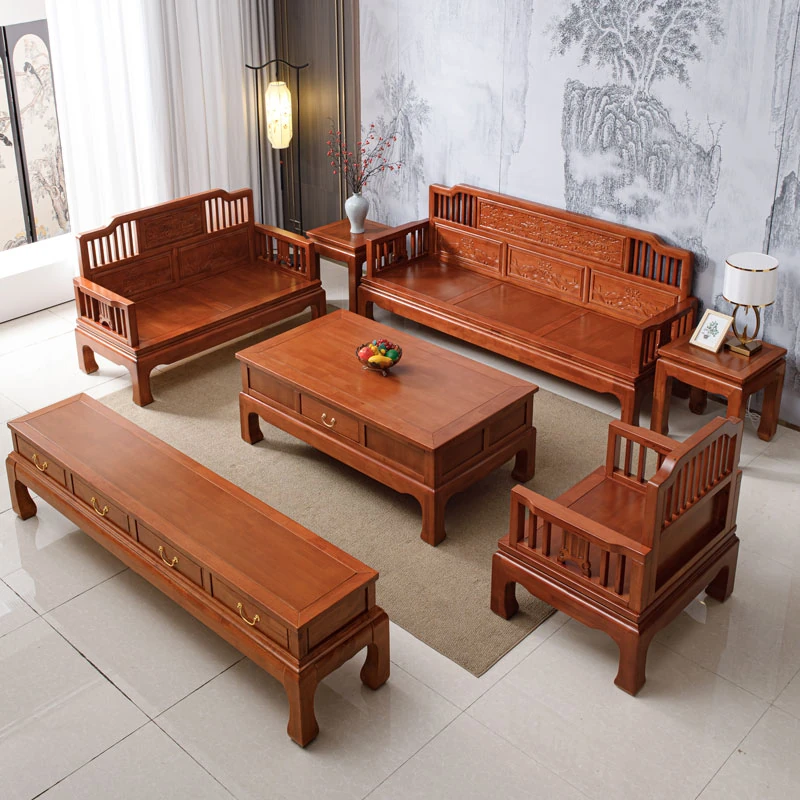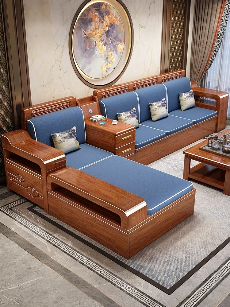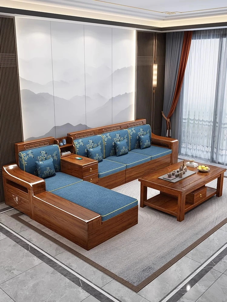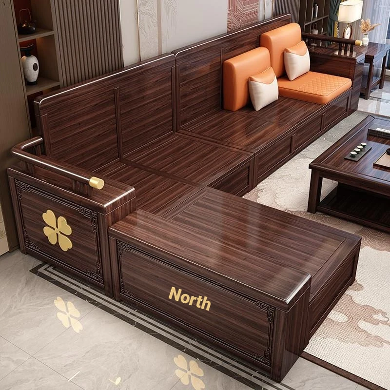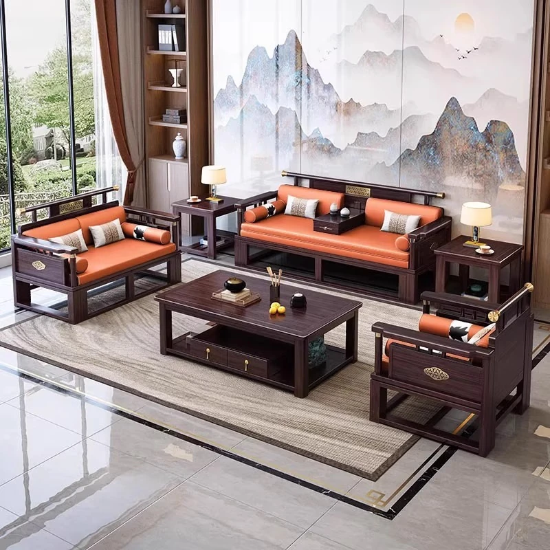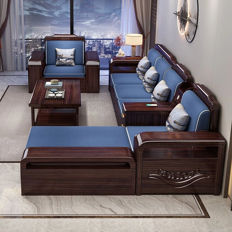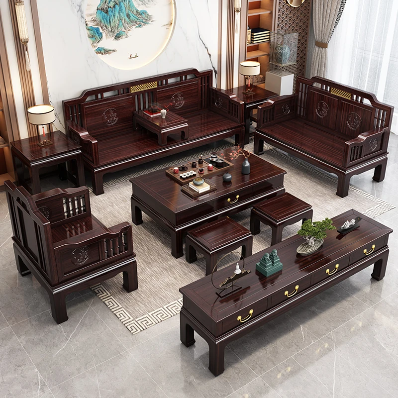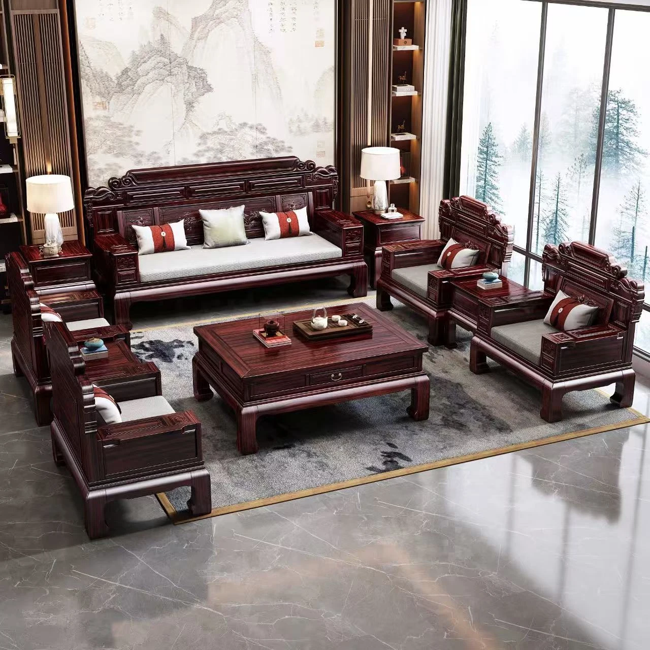 Modern Chinese Style Blackwood Solid Wood Sofa Set for Small Living Rooms – Elegant, Space-Saving Design with Storage and Carved Details for Year-Round Comfort
