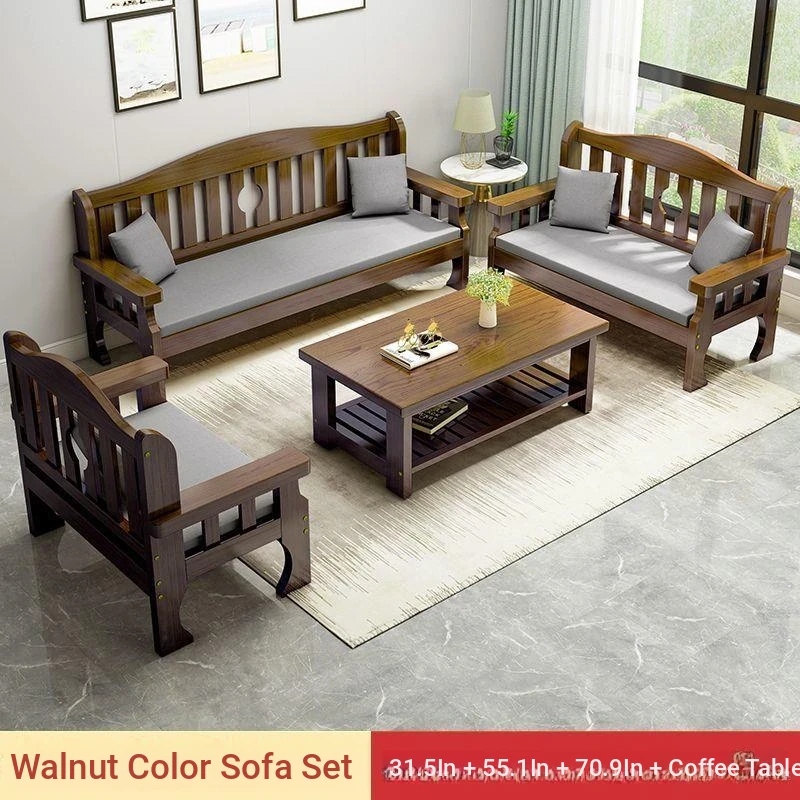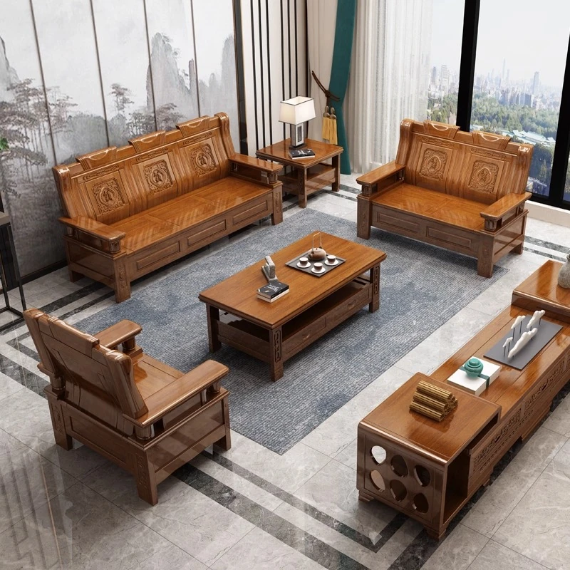 Walnut Solid Wood Sofa Set - Modern Chinese Style Living Room Furniture for Small to Medium Homes - Includes Sofa, Coffee Table, and TV Stand
