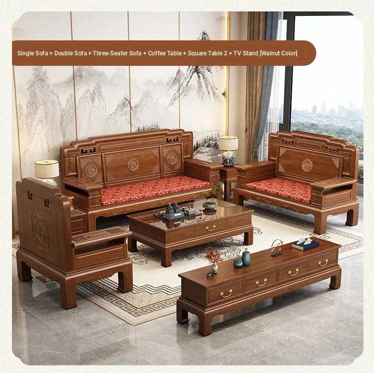 [Sour Branch Wood] Single + Single + Double + Three + Long Tea Table +3 Square Table + TV Cabinet [Send Cushion Pillow + Long Tea Table Square Tempered Glass]]
