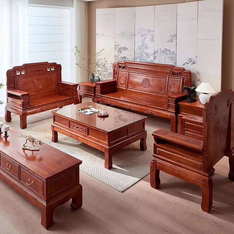 Solid Wood Sofa Set - Traditional Chinese Red Wood Living Room Furniture for Home and Office - Comfortable 3-Seater with Spring and Autumn Chair & Coffee Table - Free Shipping