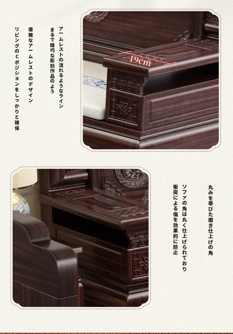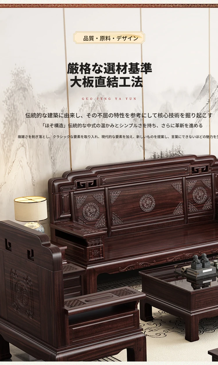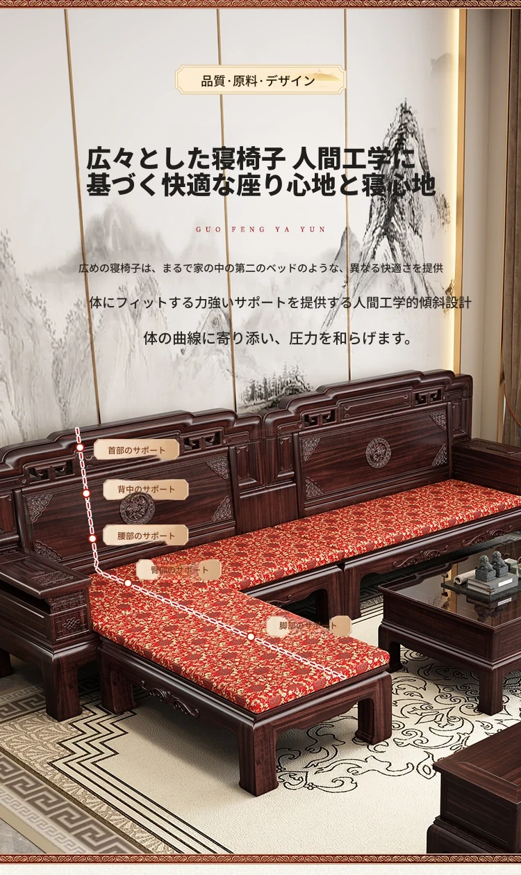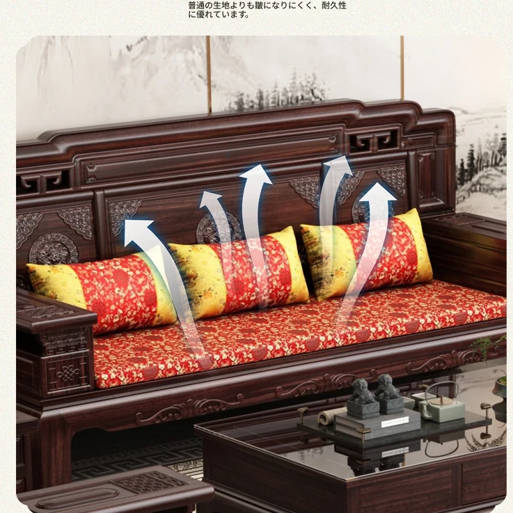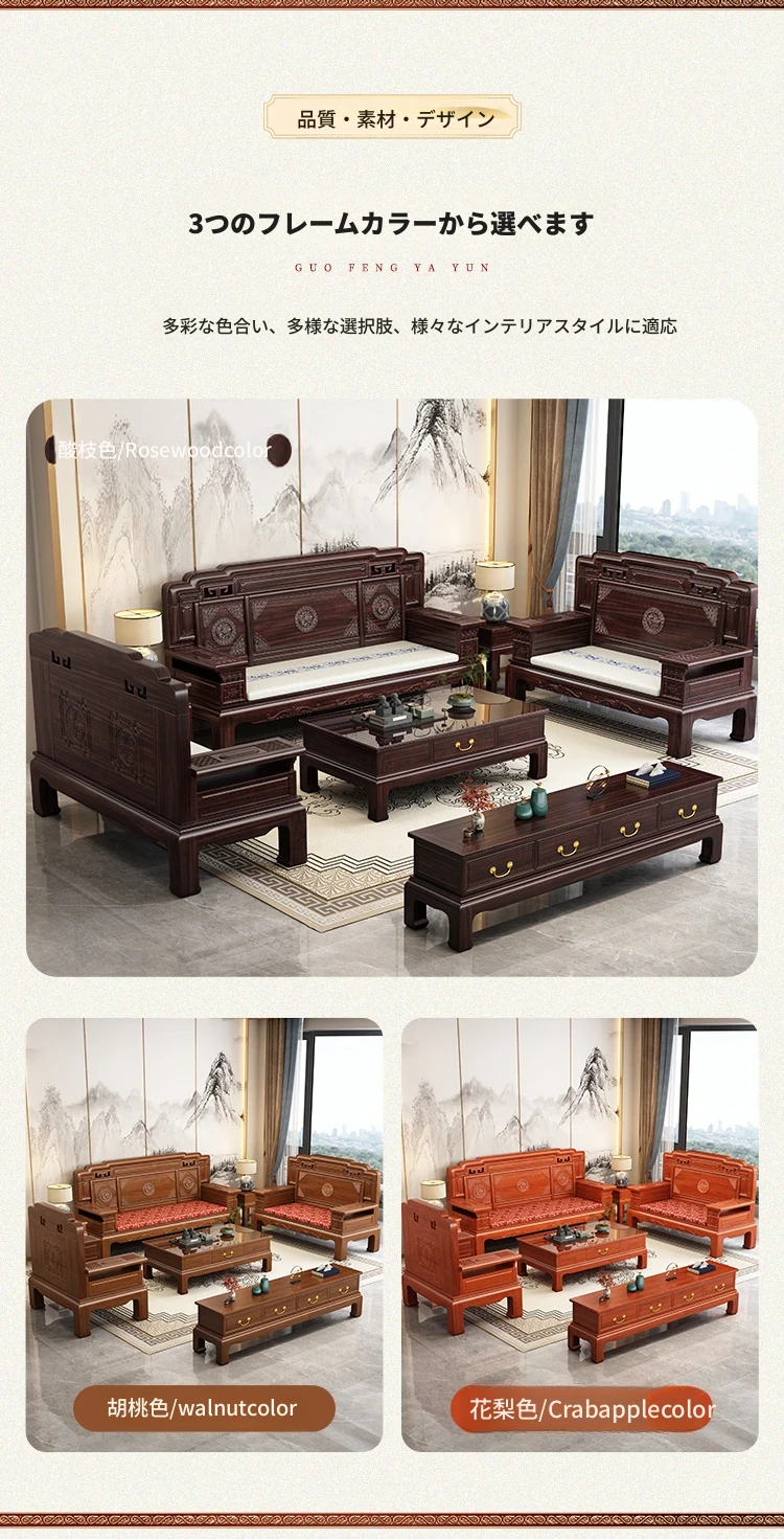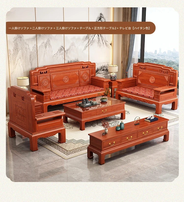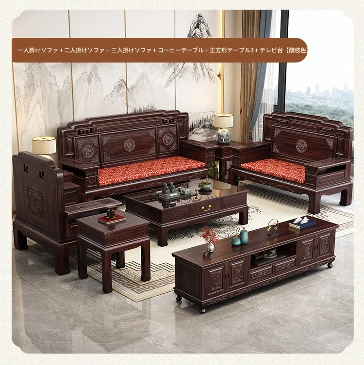 新中式スタイルの酸枝木無垢材ソファセット - 古典的な彫刻が施されたシンプルで洗練されたデザイン!冬と夏の両方で快適に使える赤木製リビング家具。高級感あふれる空間を演出し、心地よいひとときを提供します。