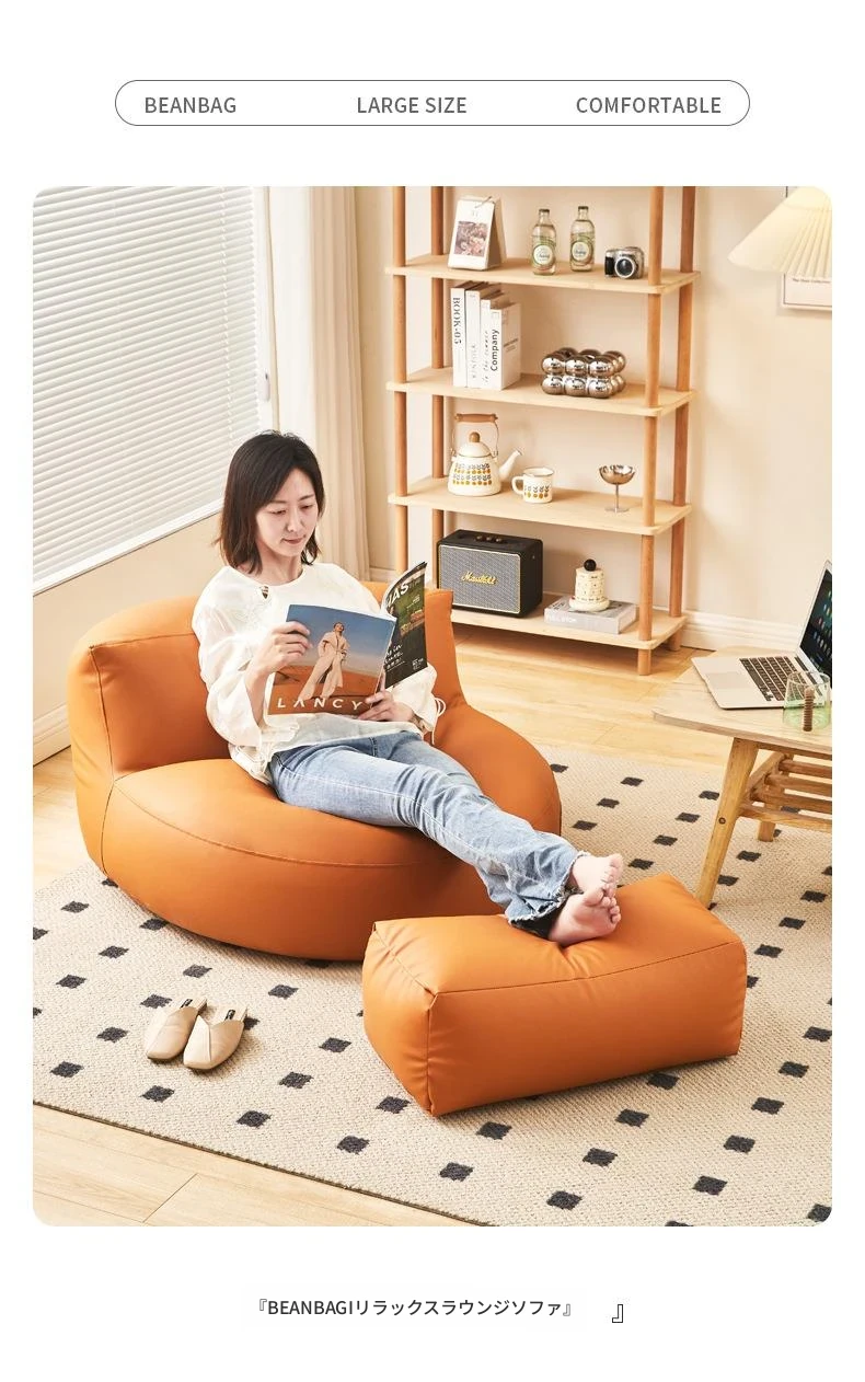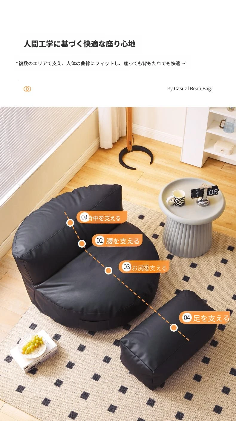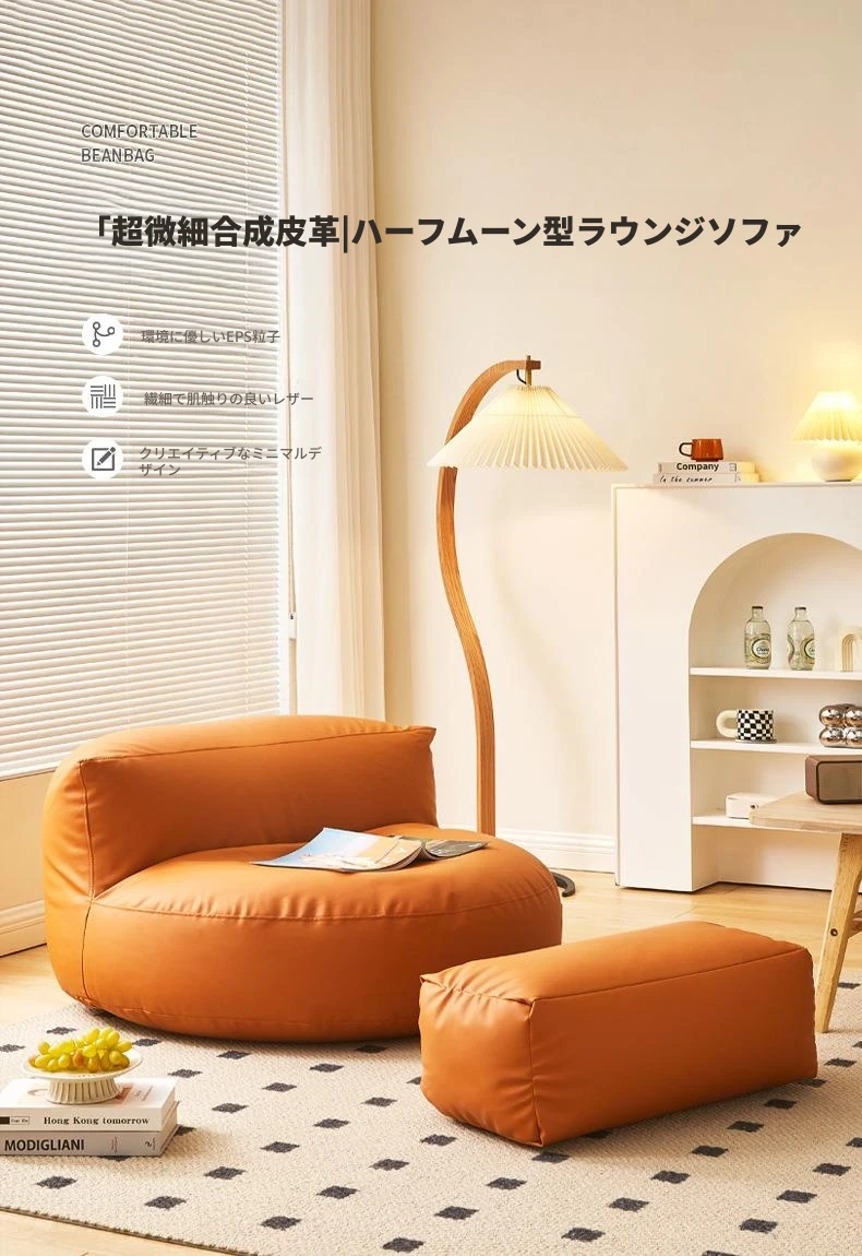 リラックスソファ!寝転んでくつろげる快適なカウチチェア。半月型デザインで、バルコニーやタタミにぴったり。小さなスペースでも使える豆袋タイプ!あなたのリラックスタイムを贅沢に演出します。