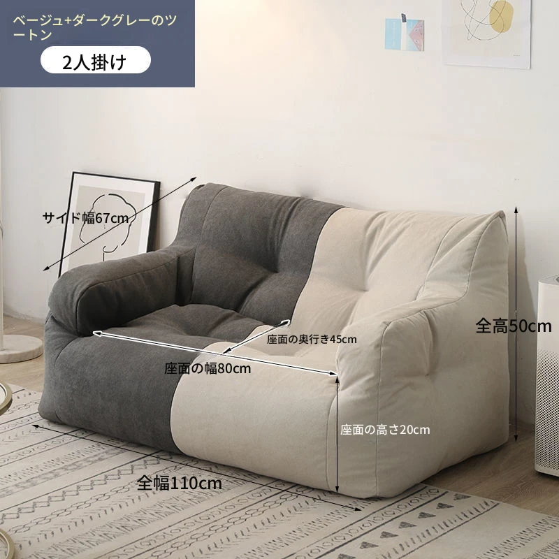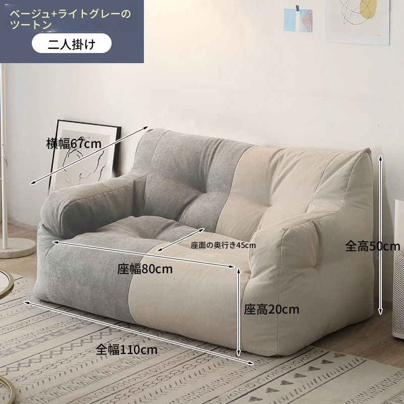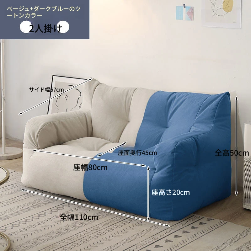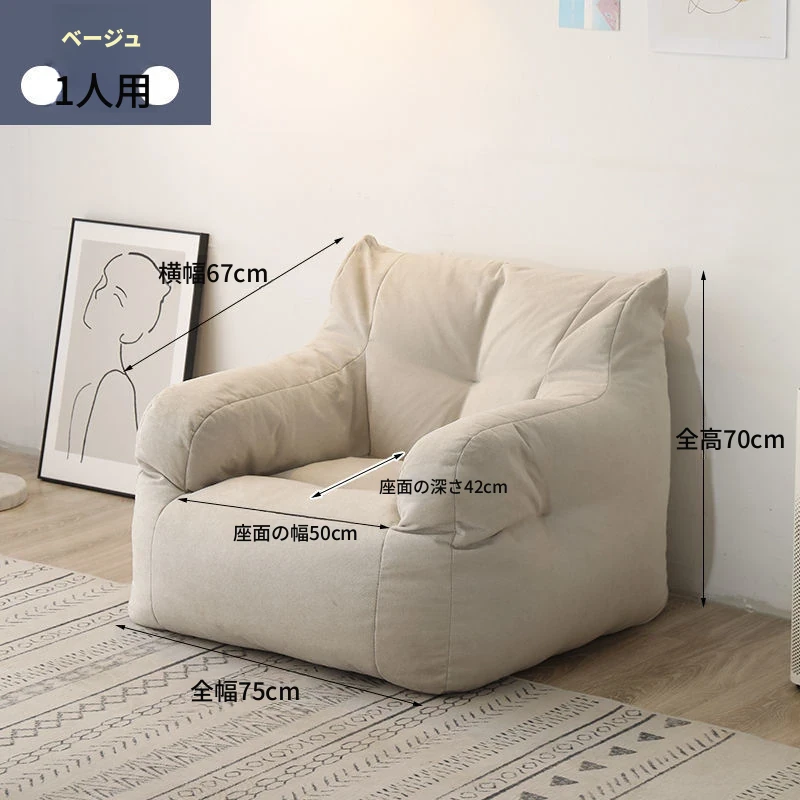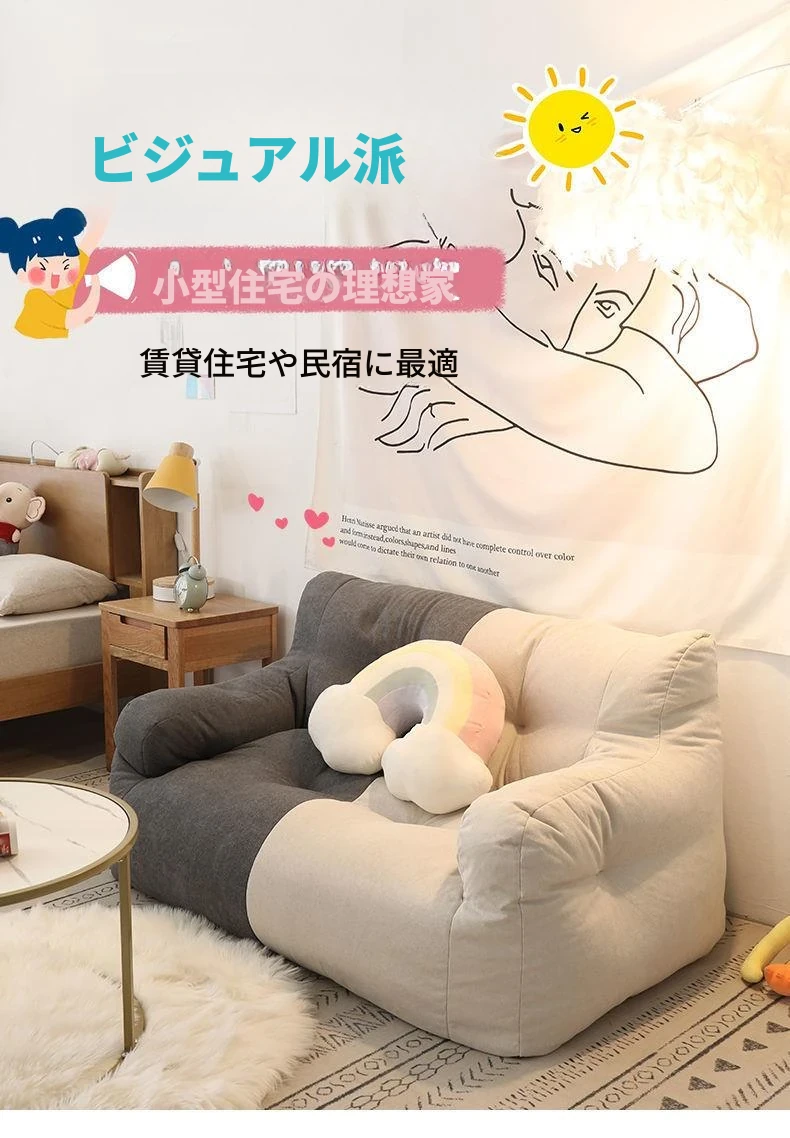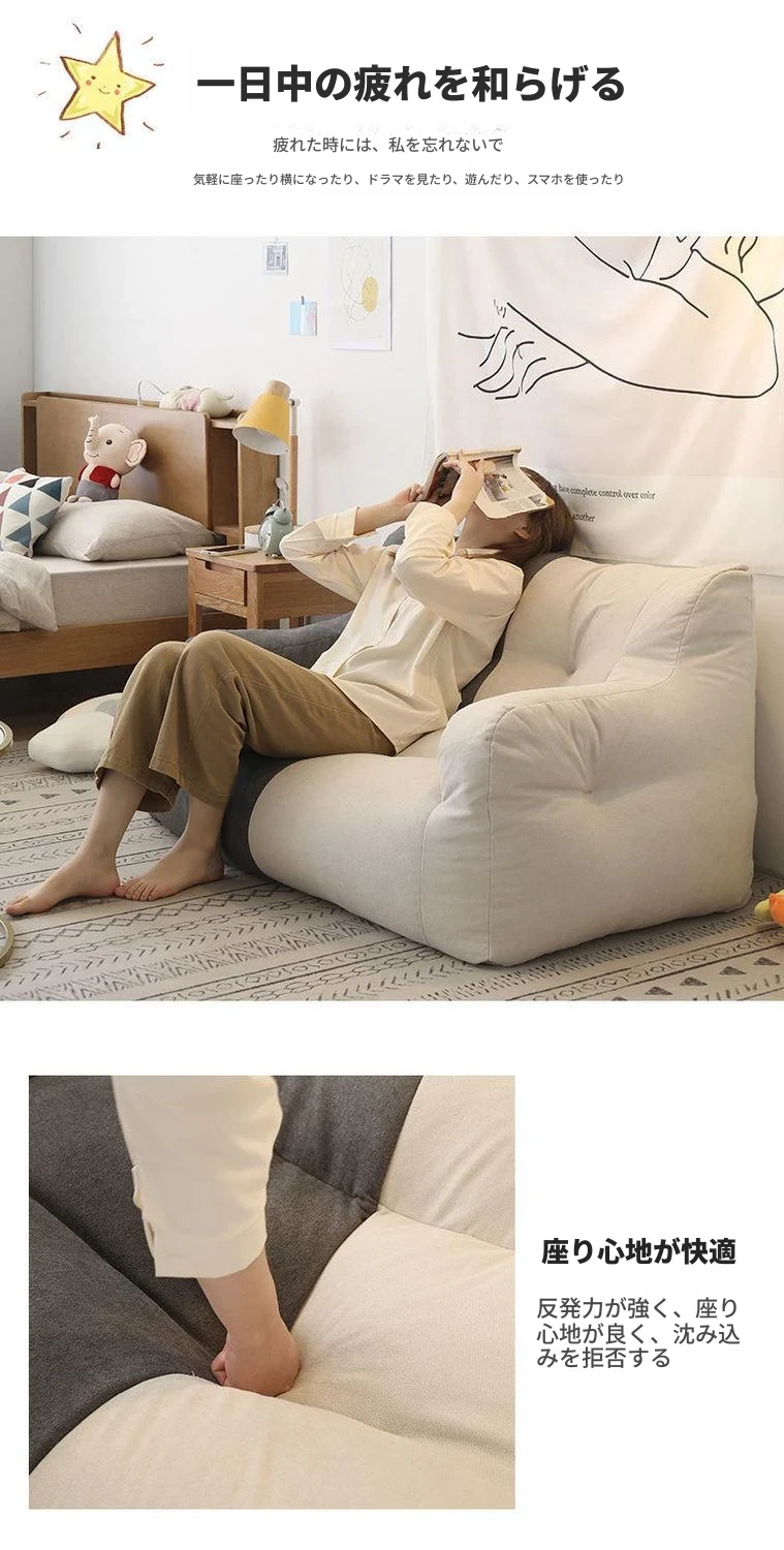 リラックスできるソファ!狭いお部屋にぴったりな寝転びソファ。寝ることもできるので、タタミやバルコニーでのリラックスタイムに最適な豆袋ソファです。