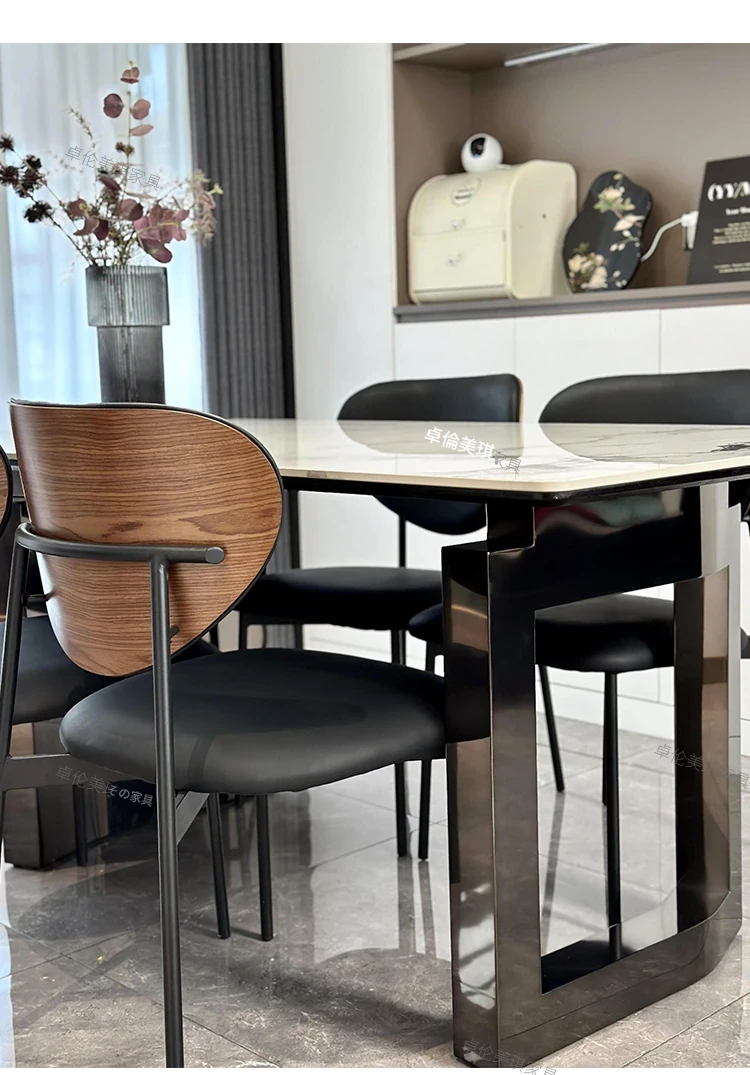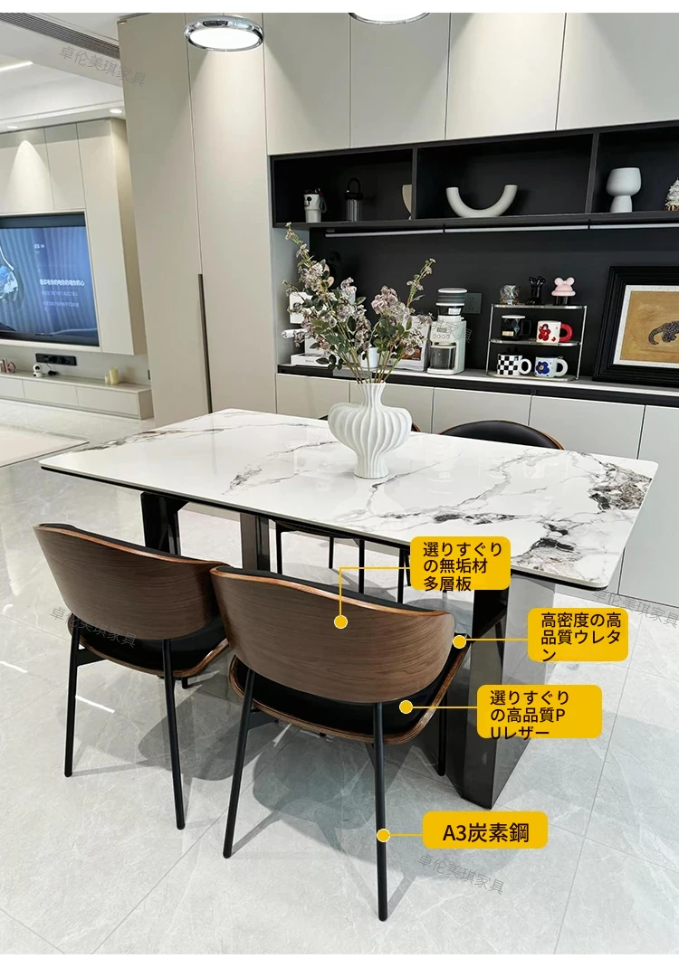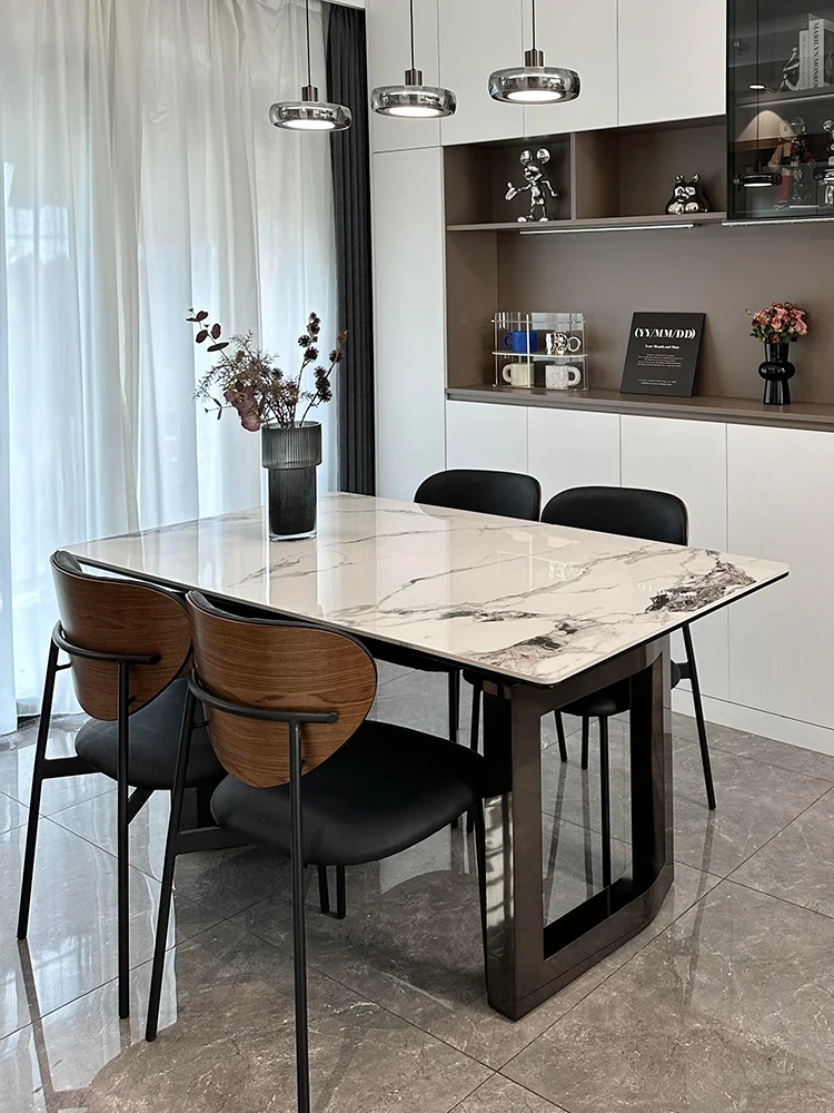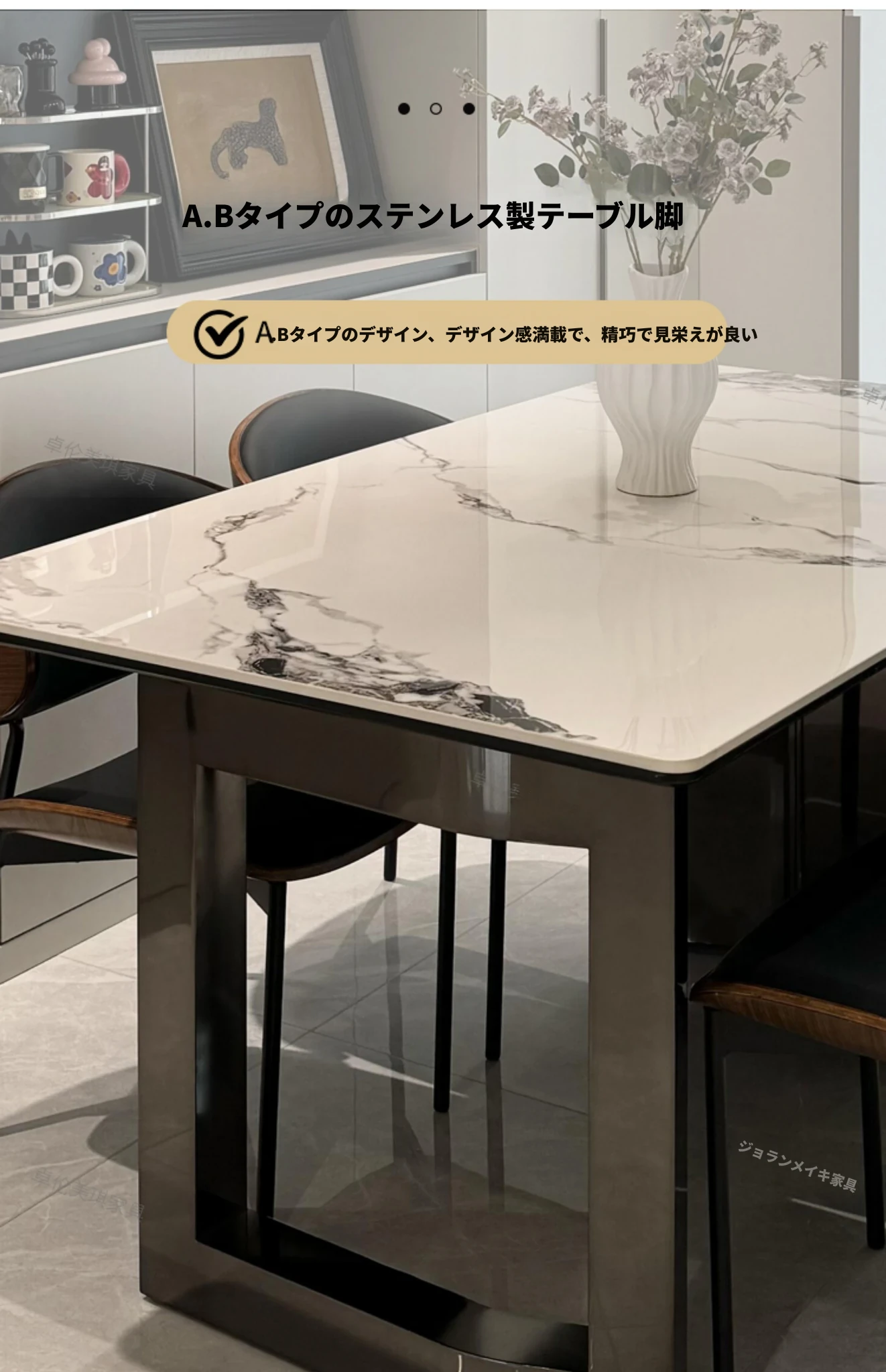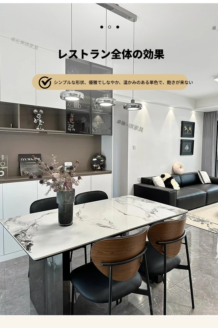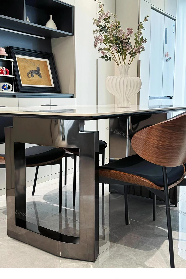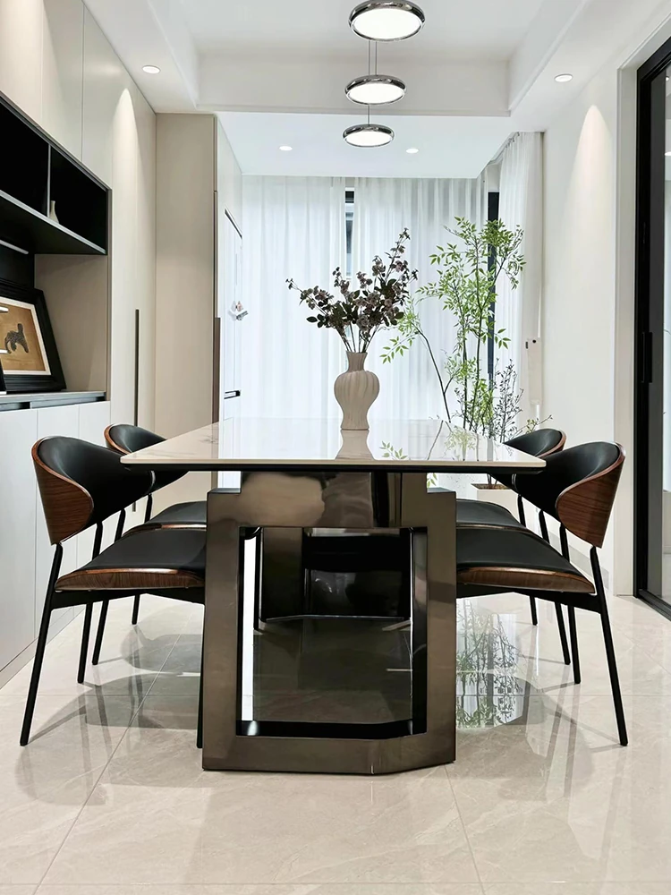 モダンでシンプルな軽奢岩板ダイニングテーブルセット - ステンレス製で、小型住宅にも最適な長方形テーブルとチェアのコンビネーション。洗練されたデザインで、心地よい食事のひとときを提供します。