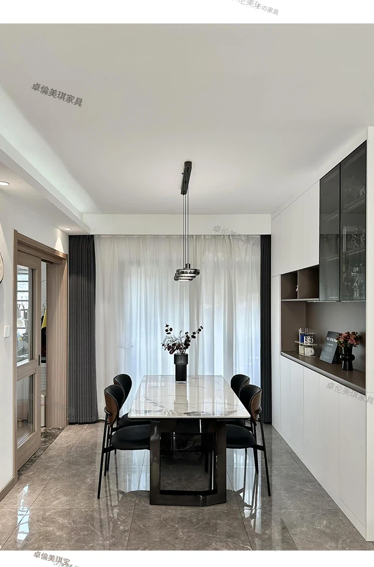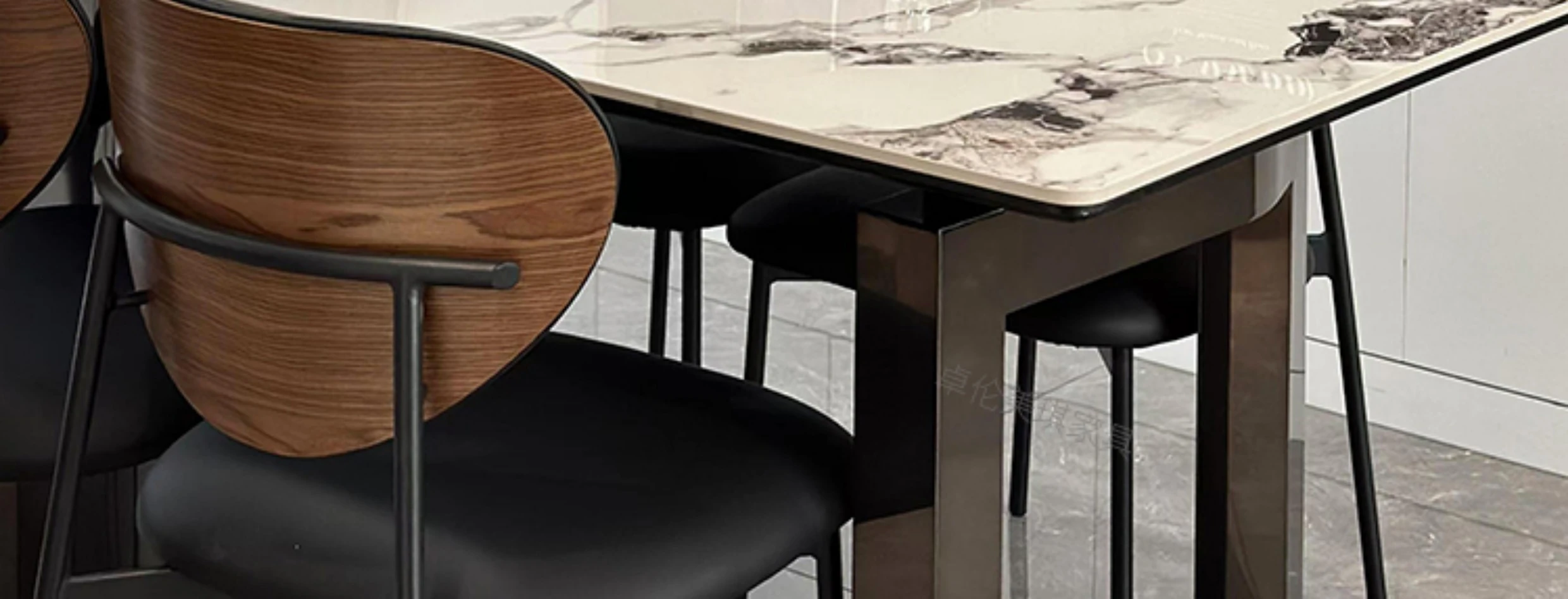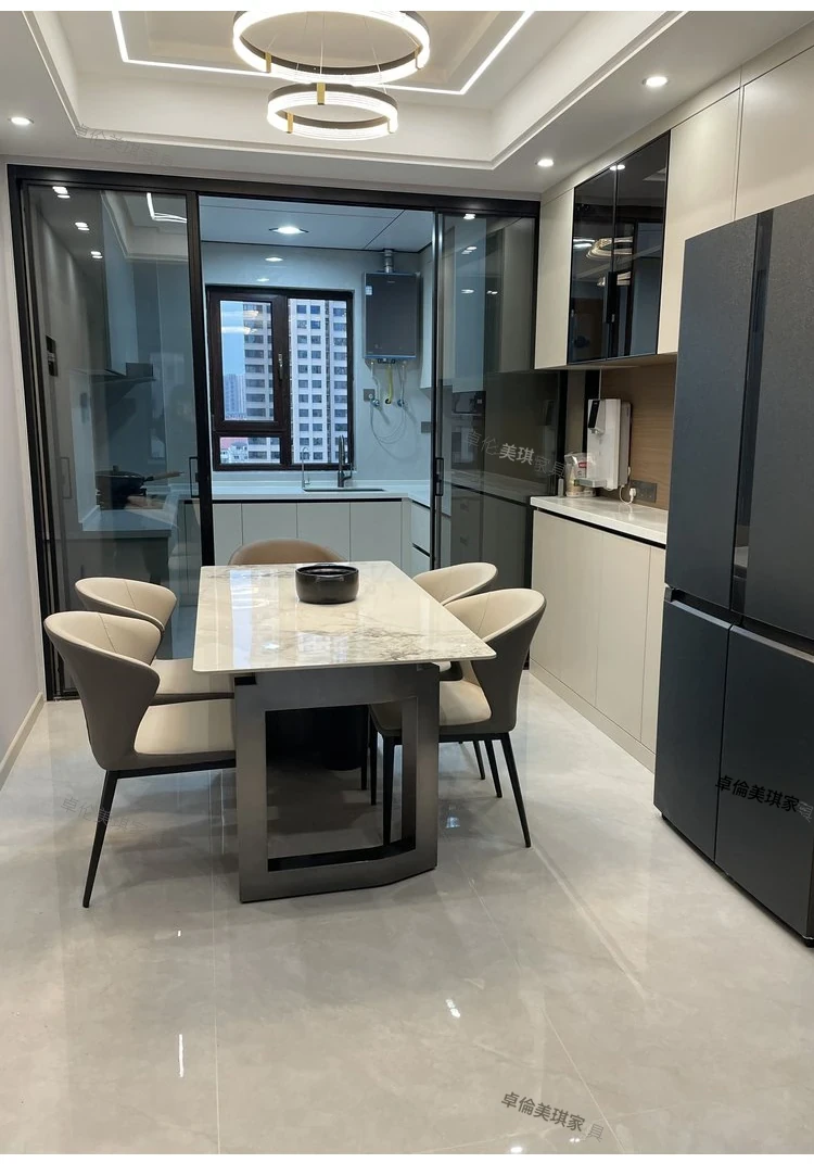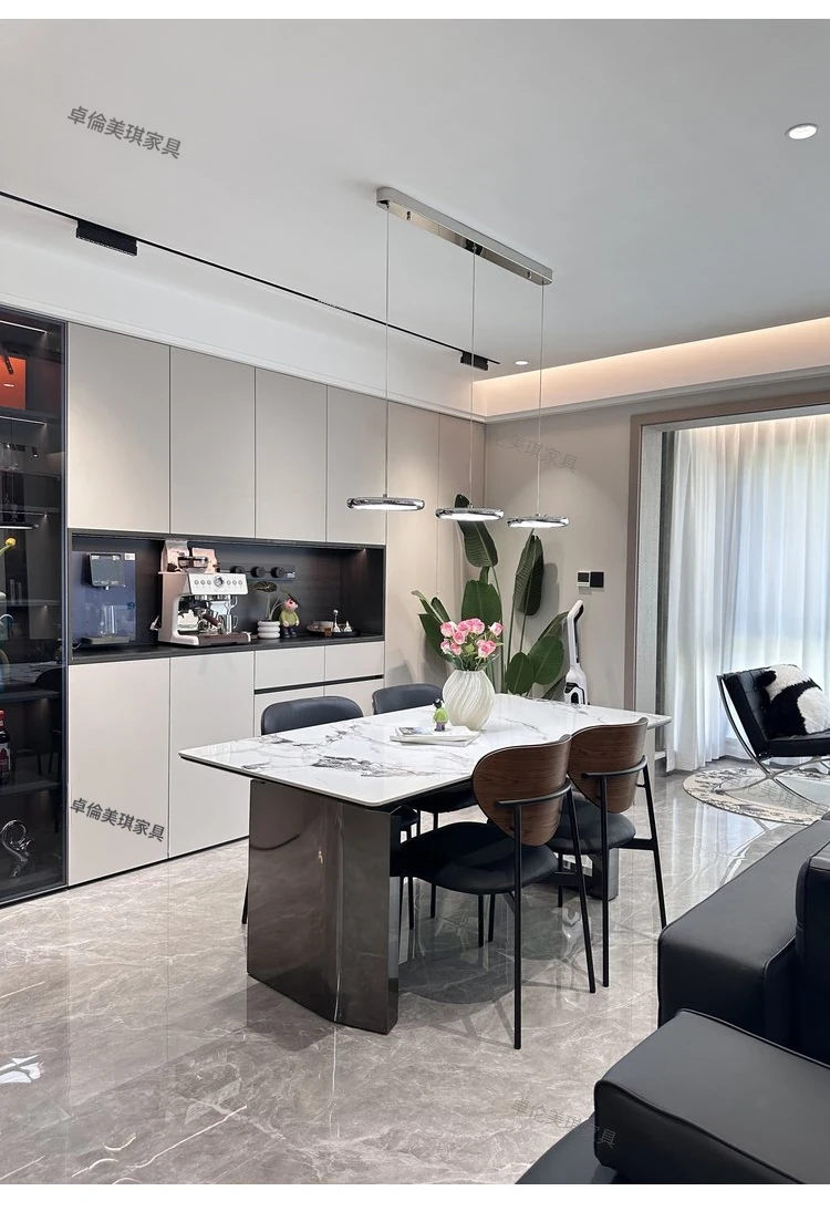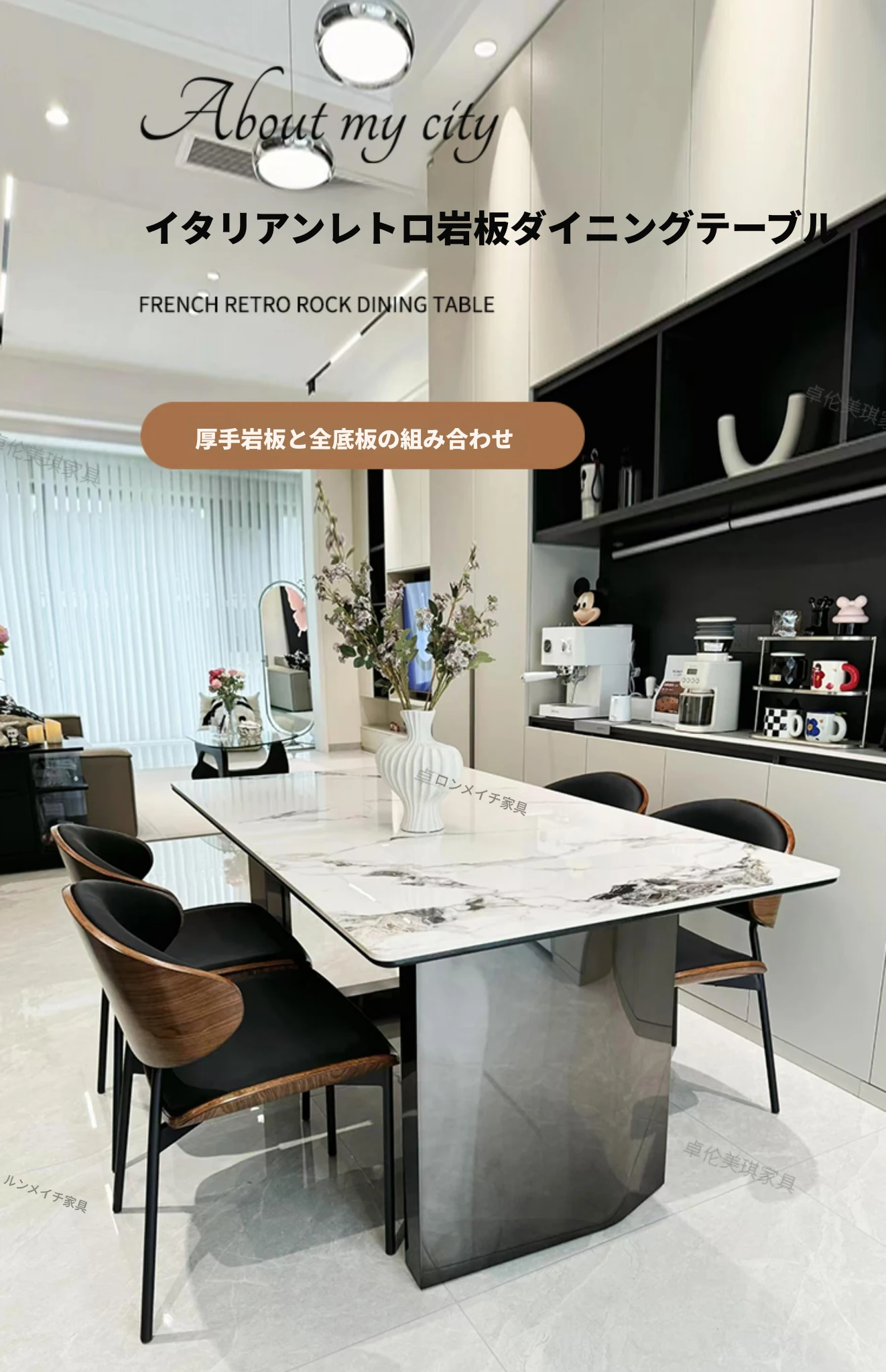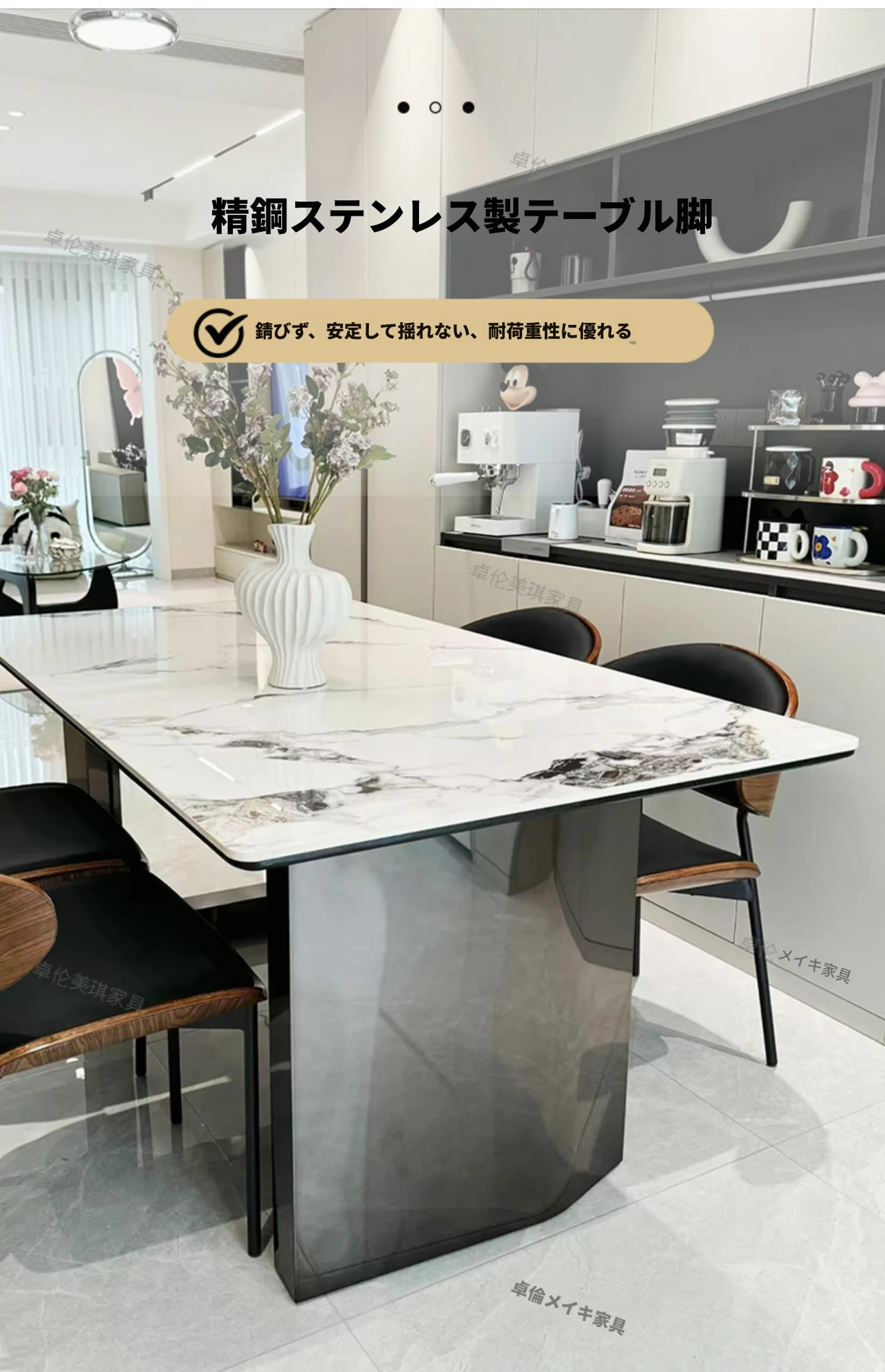 モダンでシンプルな軽奢岩板ダイニングテーブルセット - ステンレス製で、小型住宅にも最適な長方形テーブルとチェアのコンビネーション。洗練されたデザインで、心地よい食事のひとときを提供します。