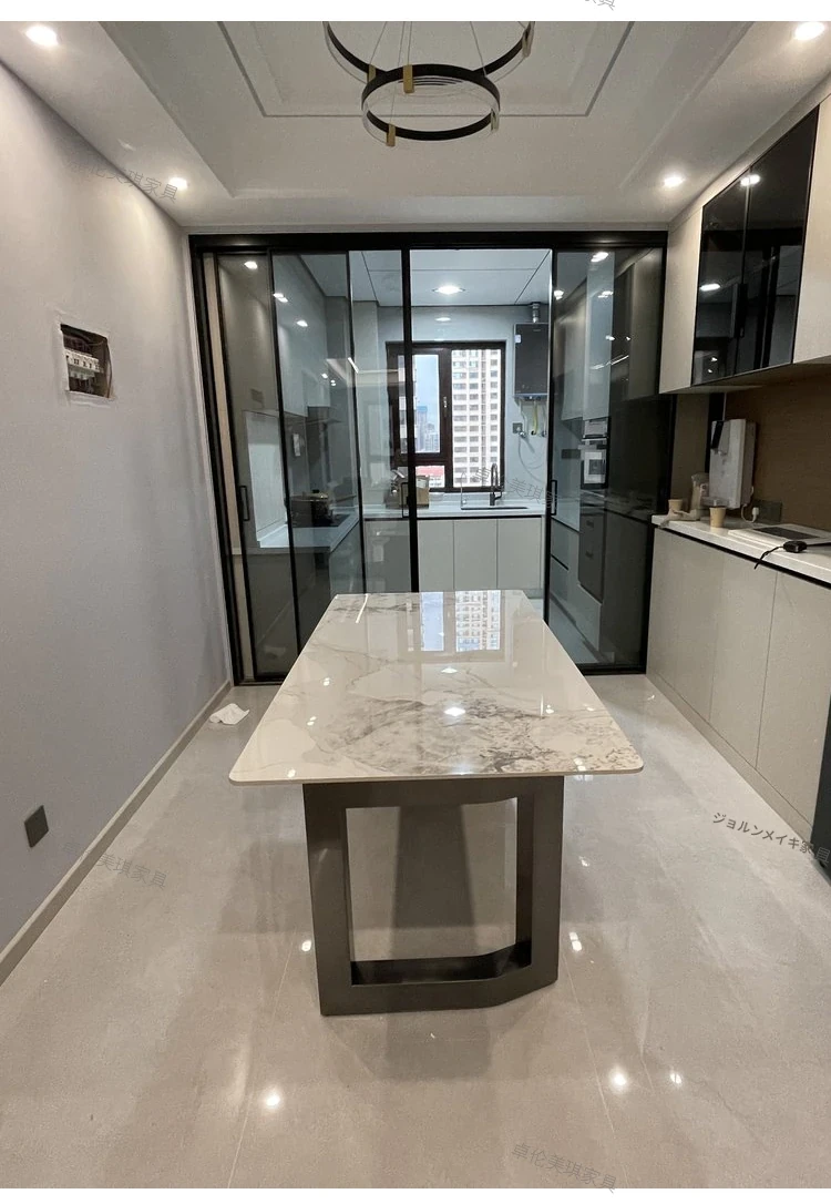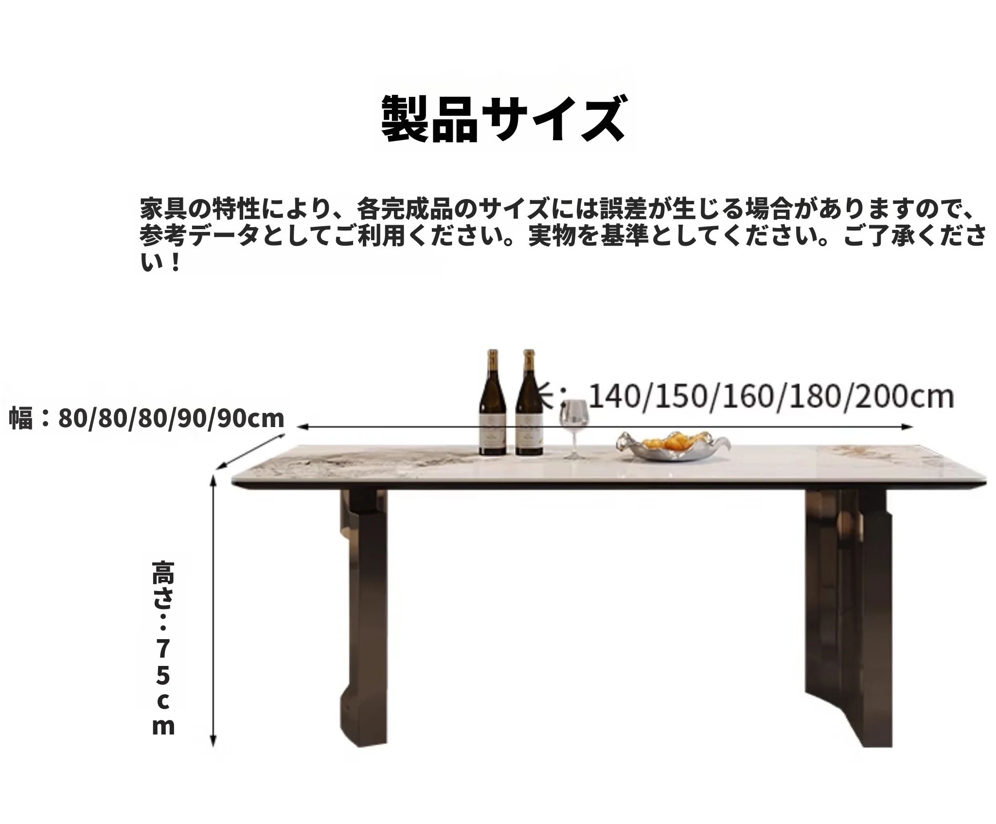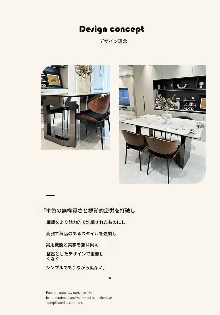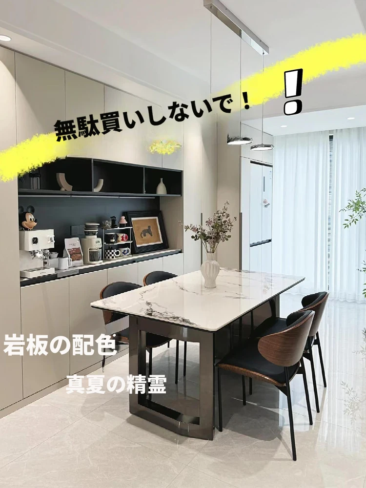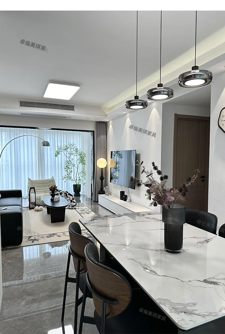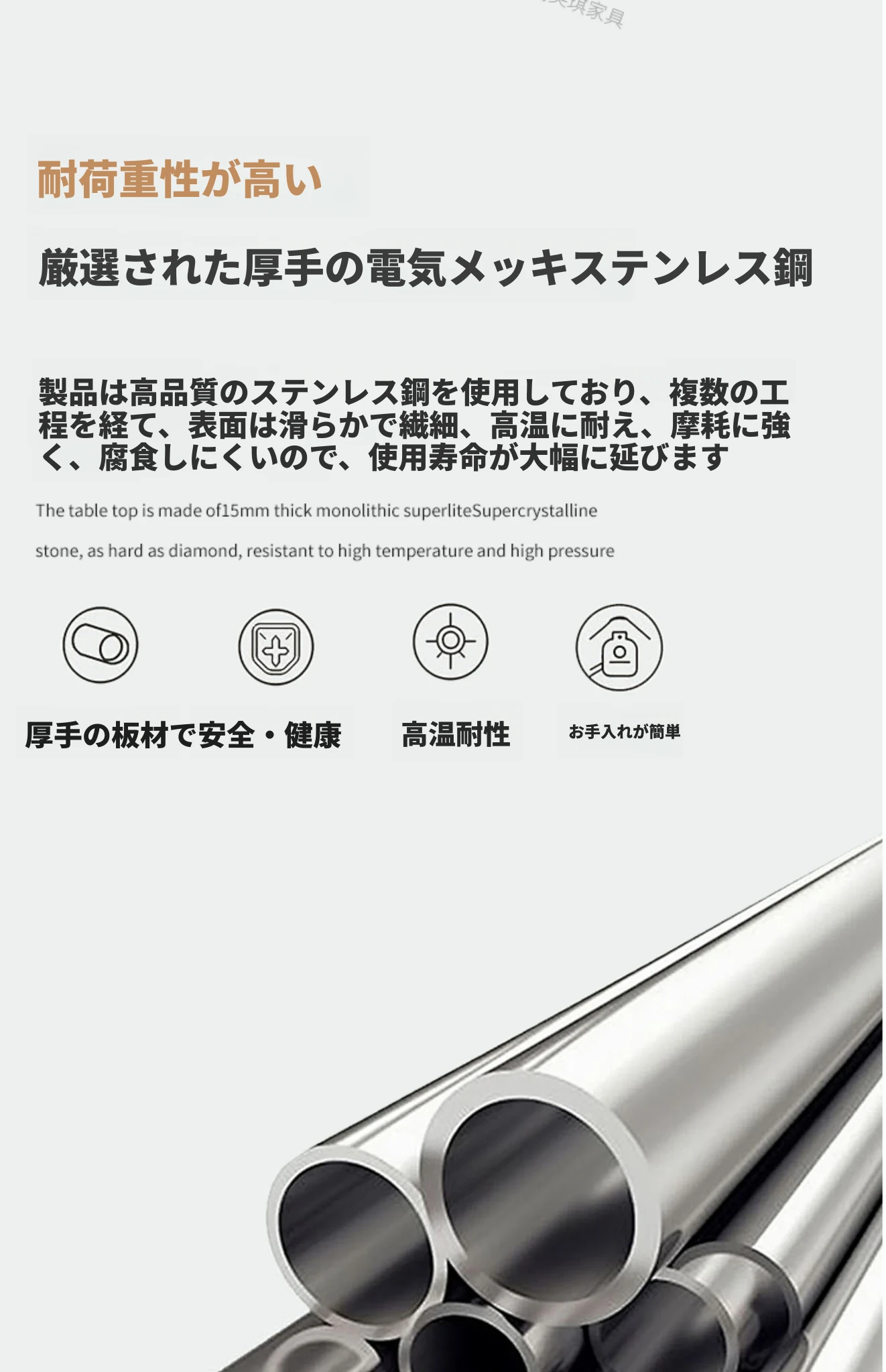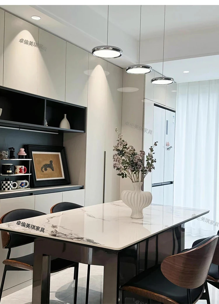 モダンでシンプルな軽奢岩板ダイニングテーブルセット - ステンレス製で、小型住宅にも最適な長方形テーブルとチェアのコンビネーション。洗練されたデザインで、心地よい食事のひとときを提供します。