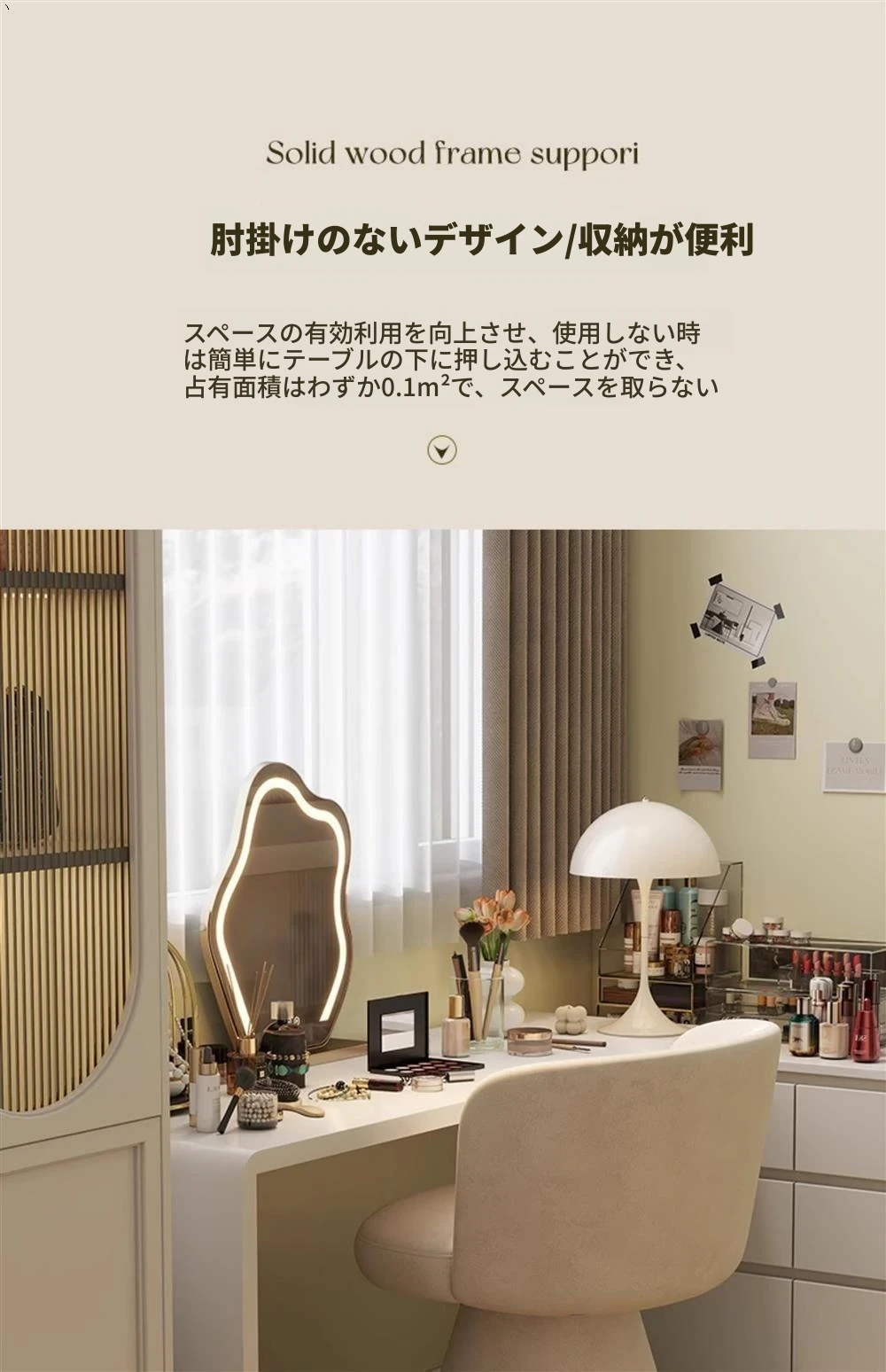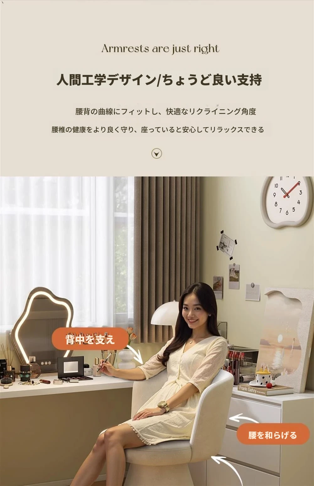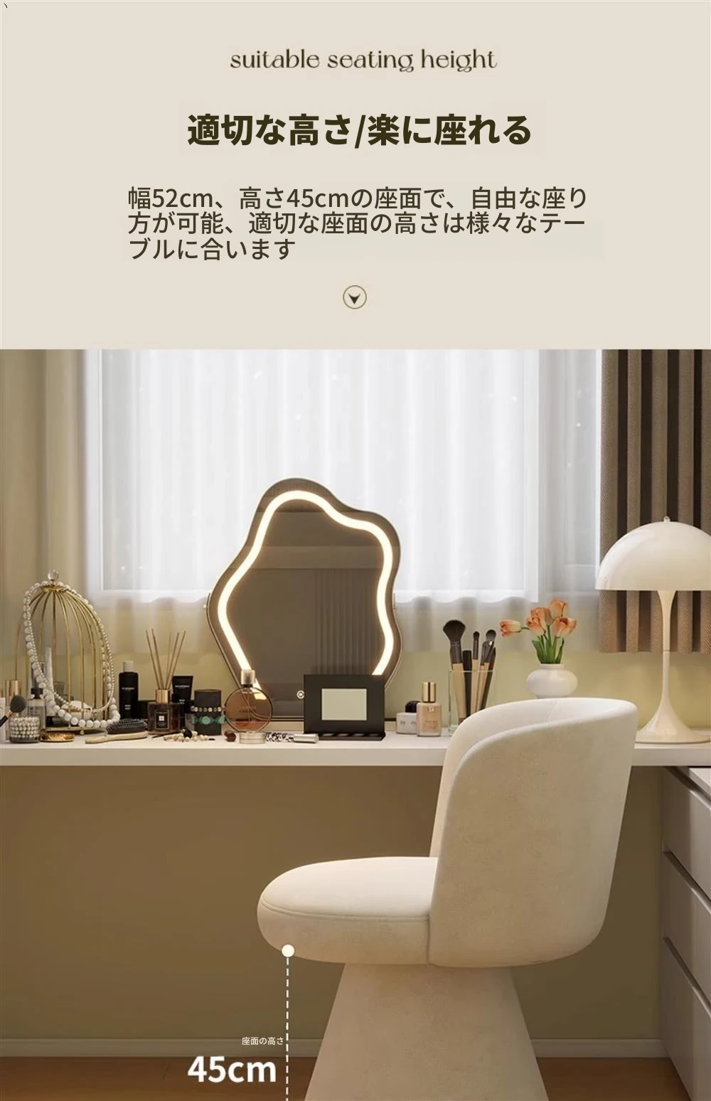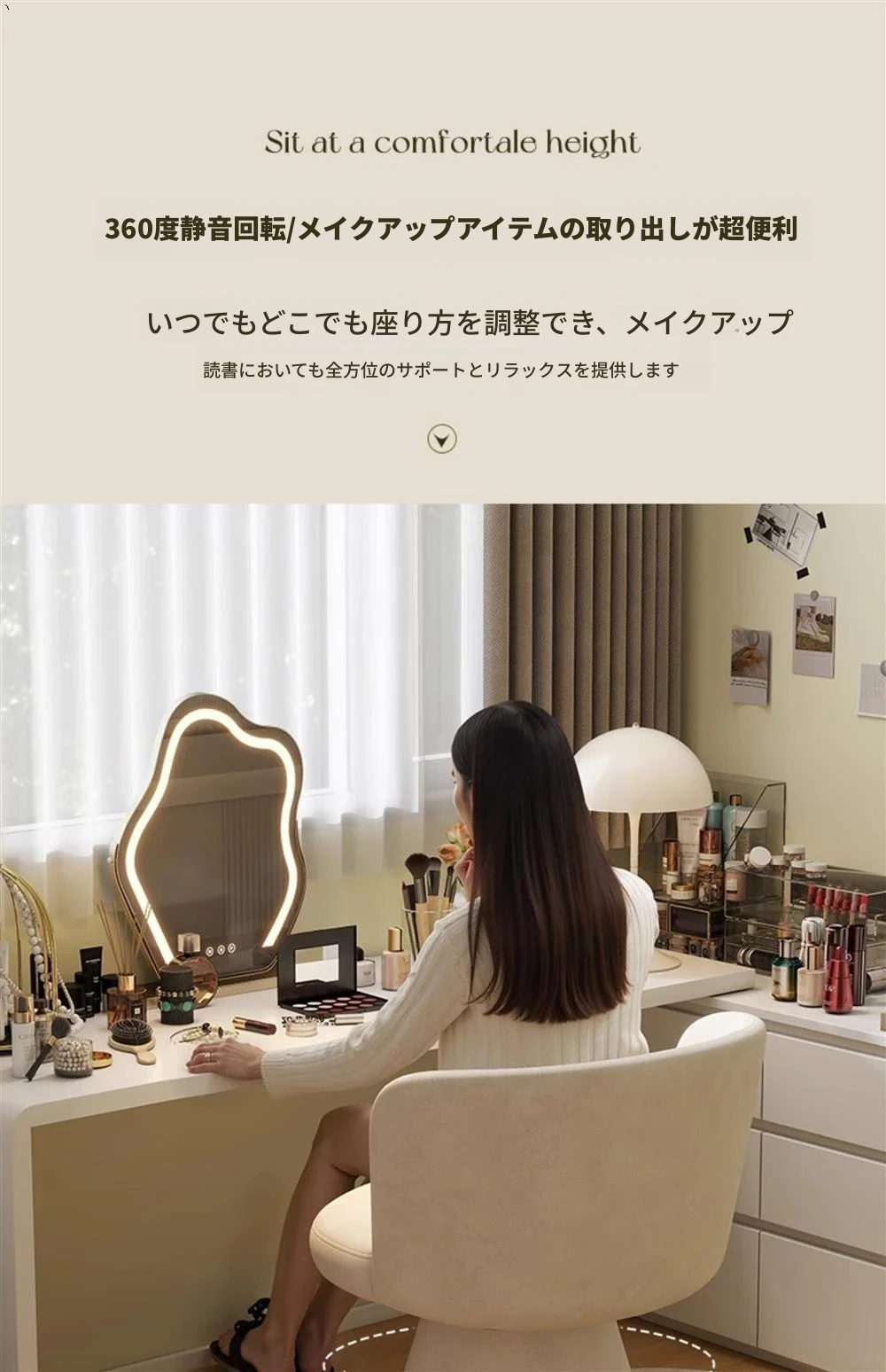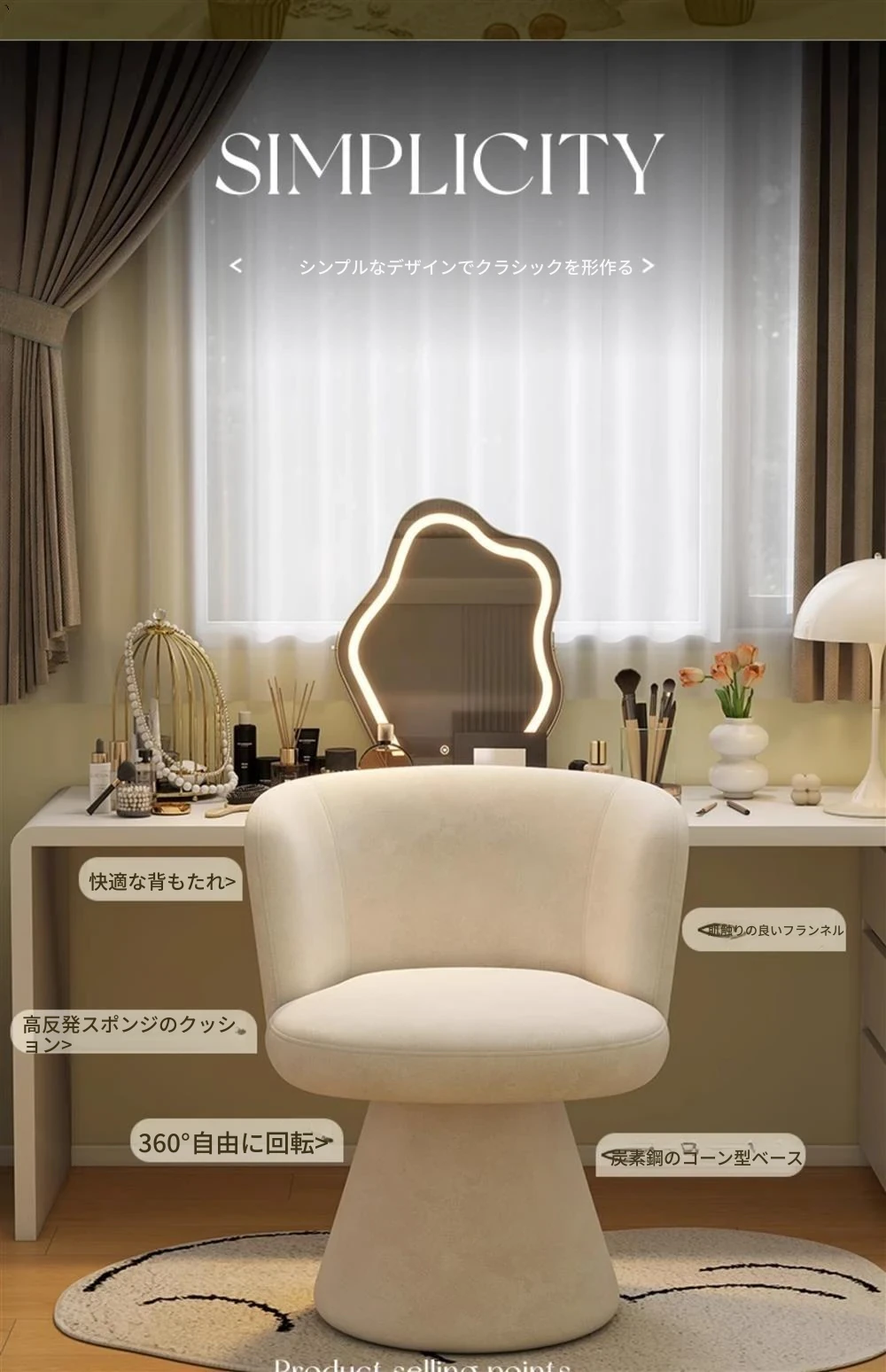 北欧スタイルの回転式メイクアップスツール|リラックスできるデザイン|おしゃれなベッドルームにぴったりのクリーム色ドレッサーチェア!