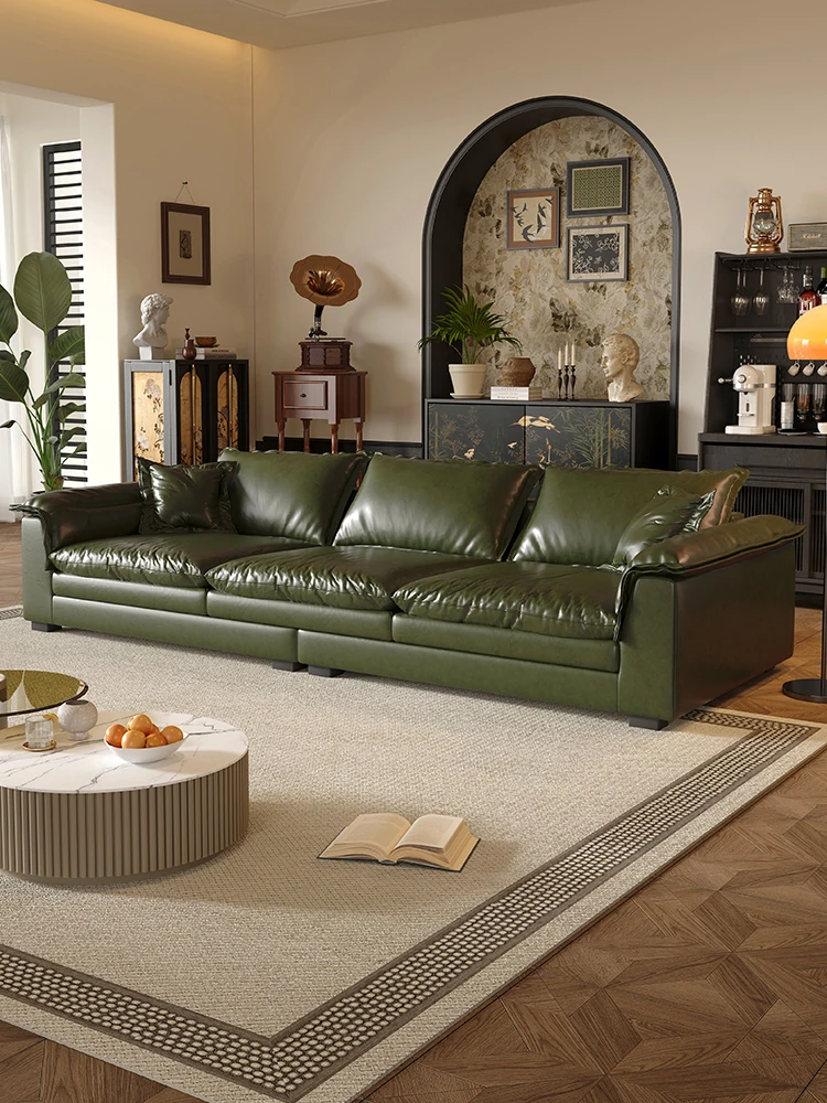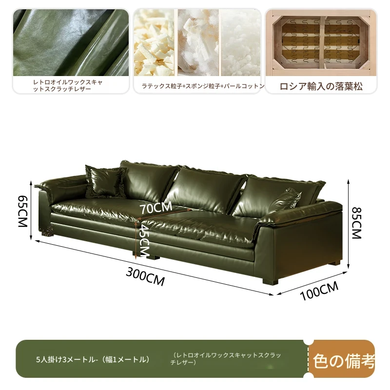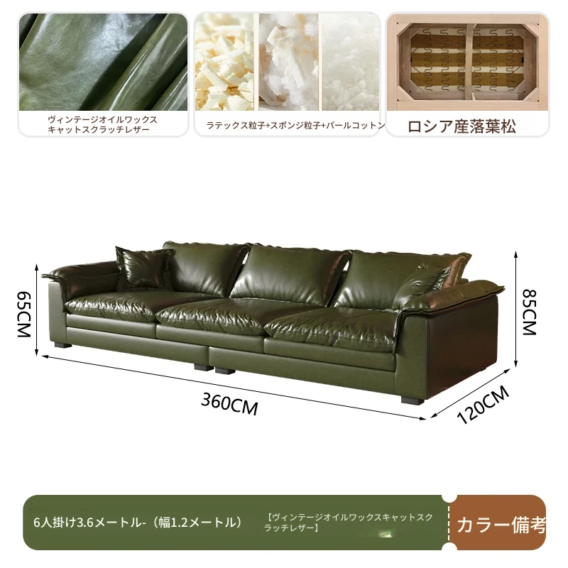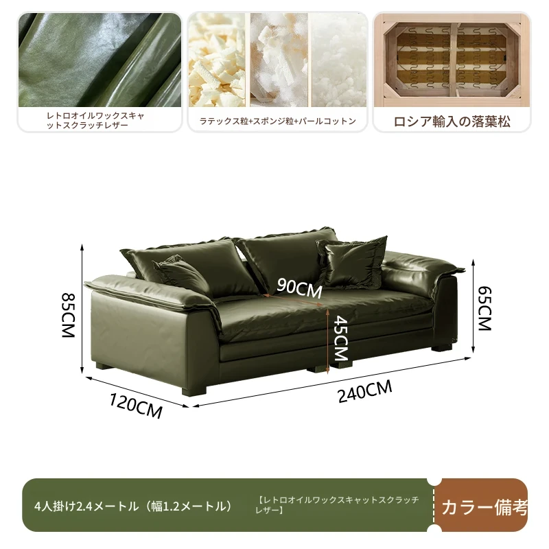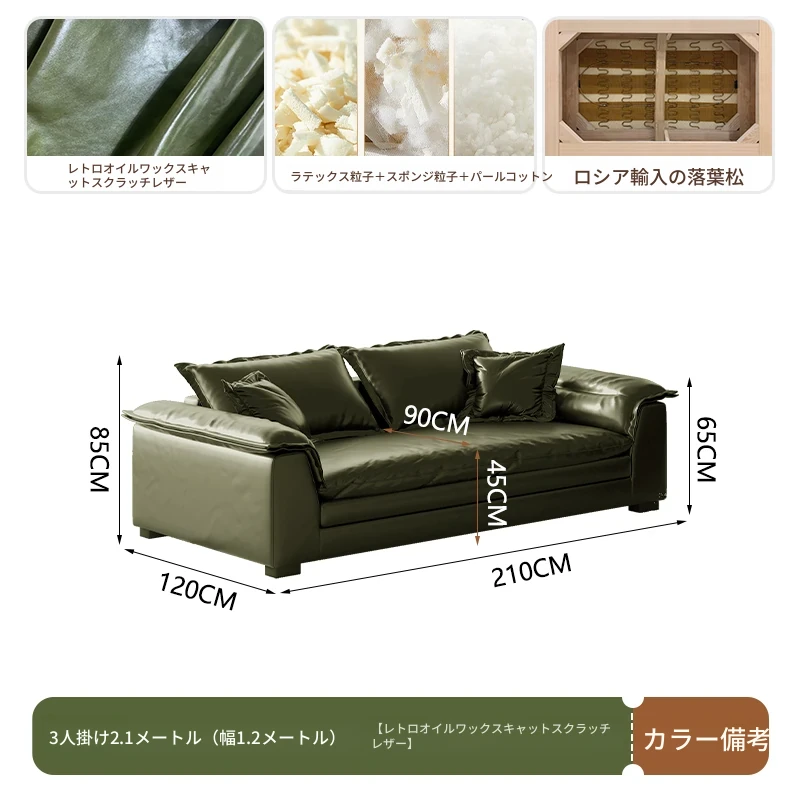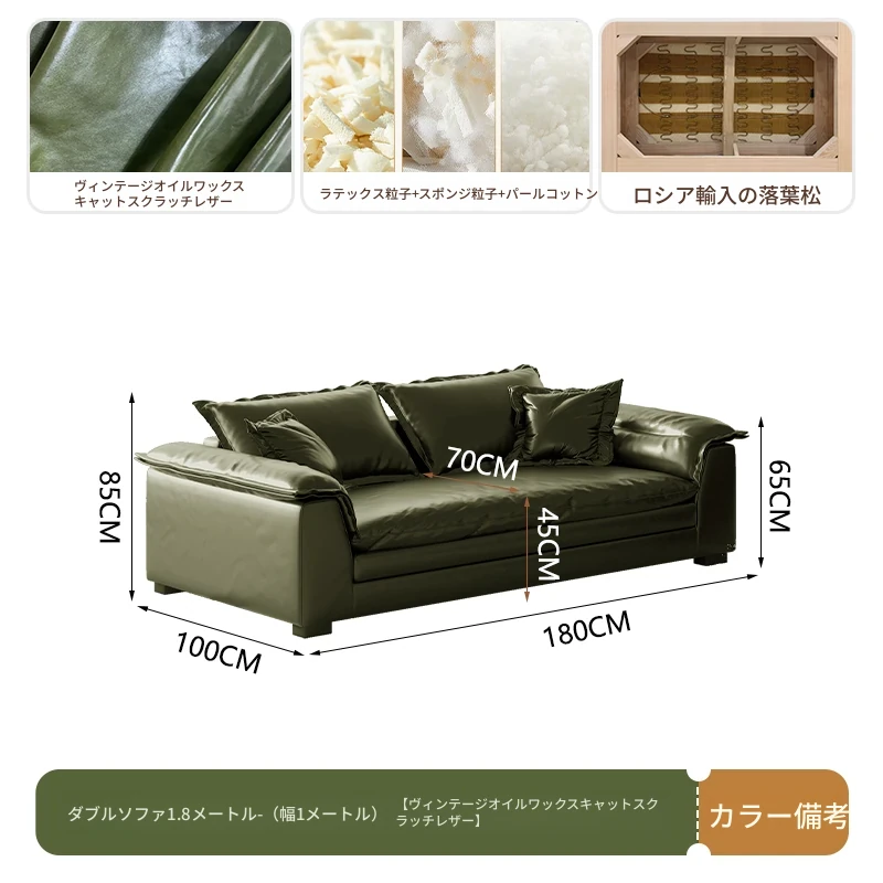 レトロ風グリーンオイルワックスレザーのイタリアンミニマリズム!コンパクトなサイズで大座深ダブルクッションのストレートソファ。おしゃれな空間を演出し、居心地の良いひとときを提供します。