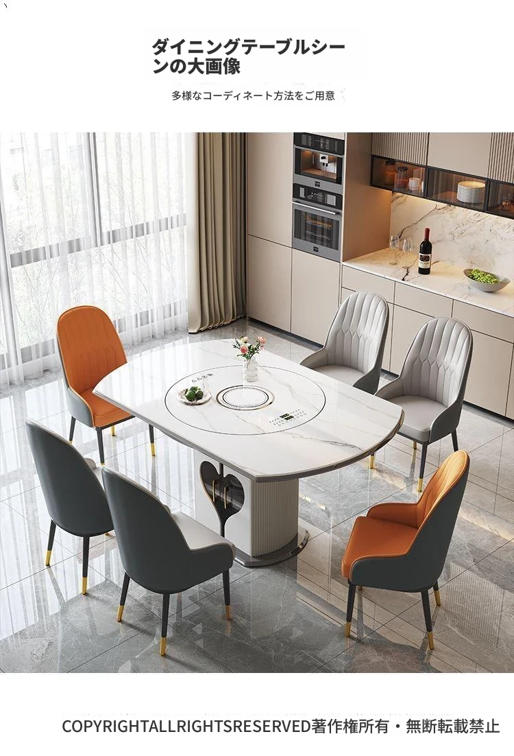 1.35メートル収納キャビネットダイニングテーブル+伯爵椅子*6【スマート音声温菜ボードプレゼント】回転式電磁調理器一体