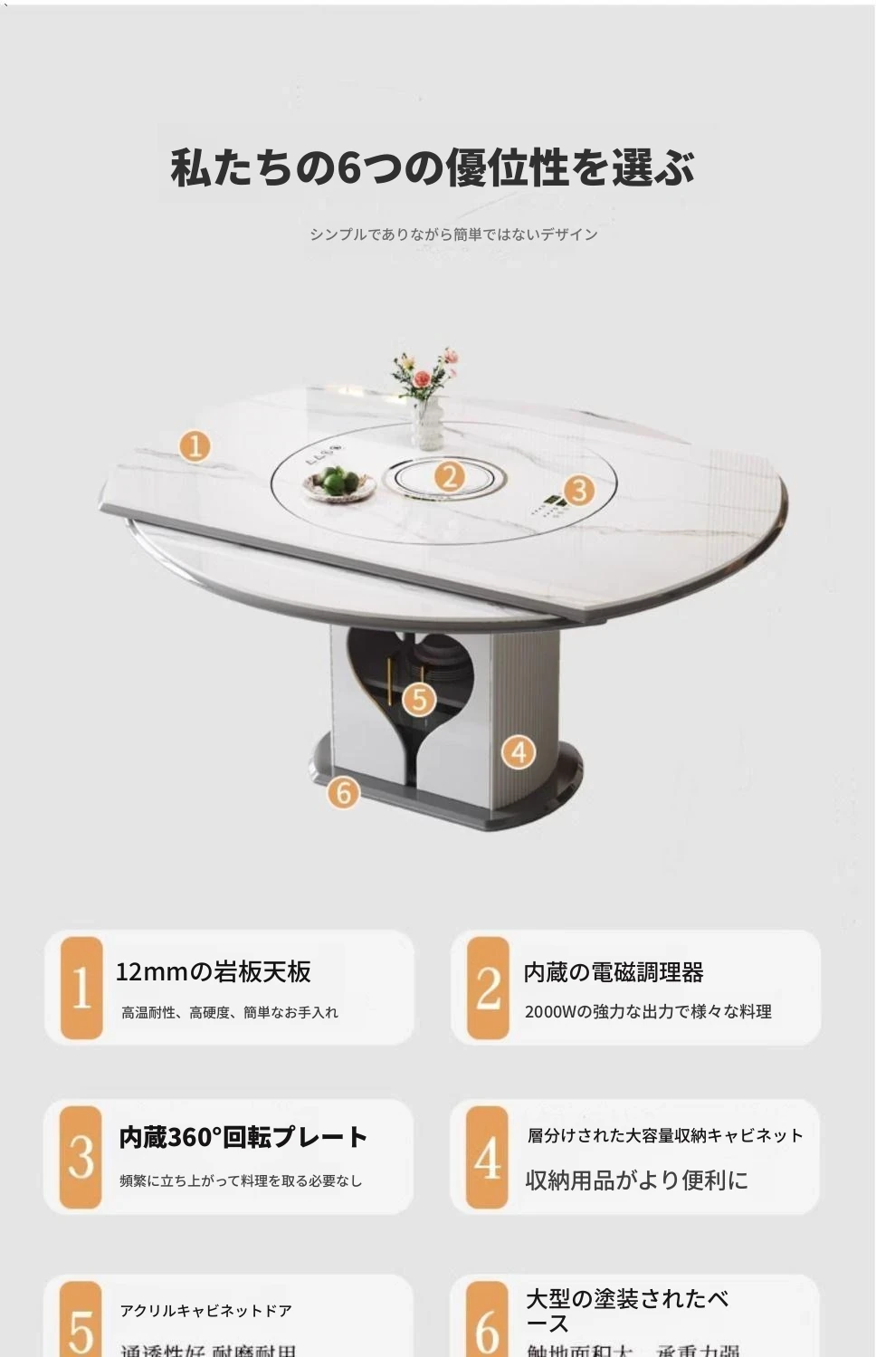 1.35メートル収納キャビネットダイニングテーブル+人形椅子*6【スマート音声温菜ボードプレゼント】回転式電磁調理器一体