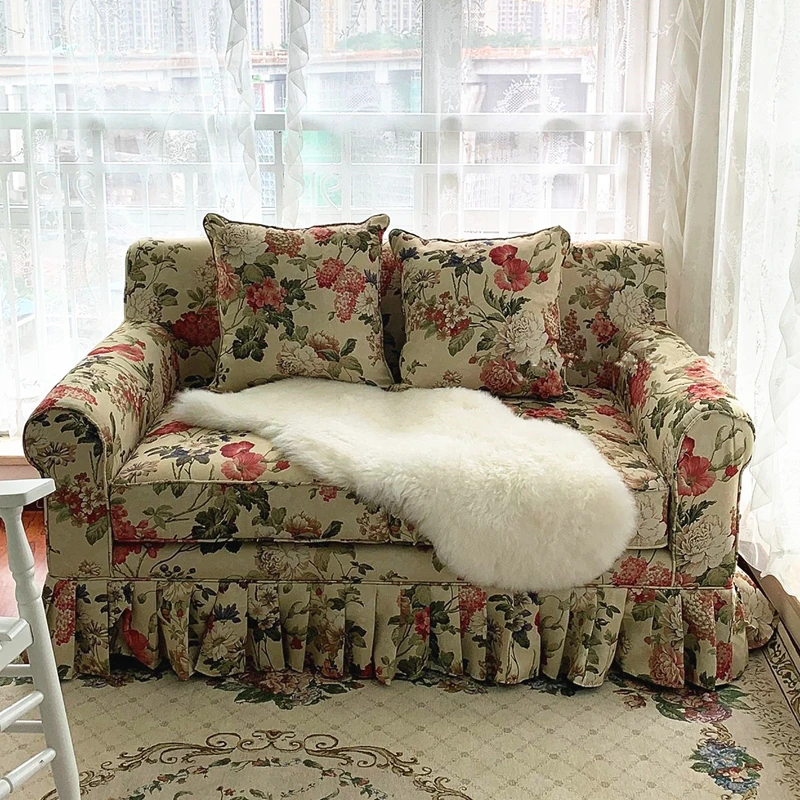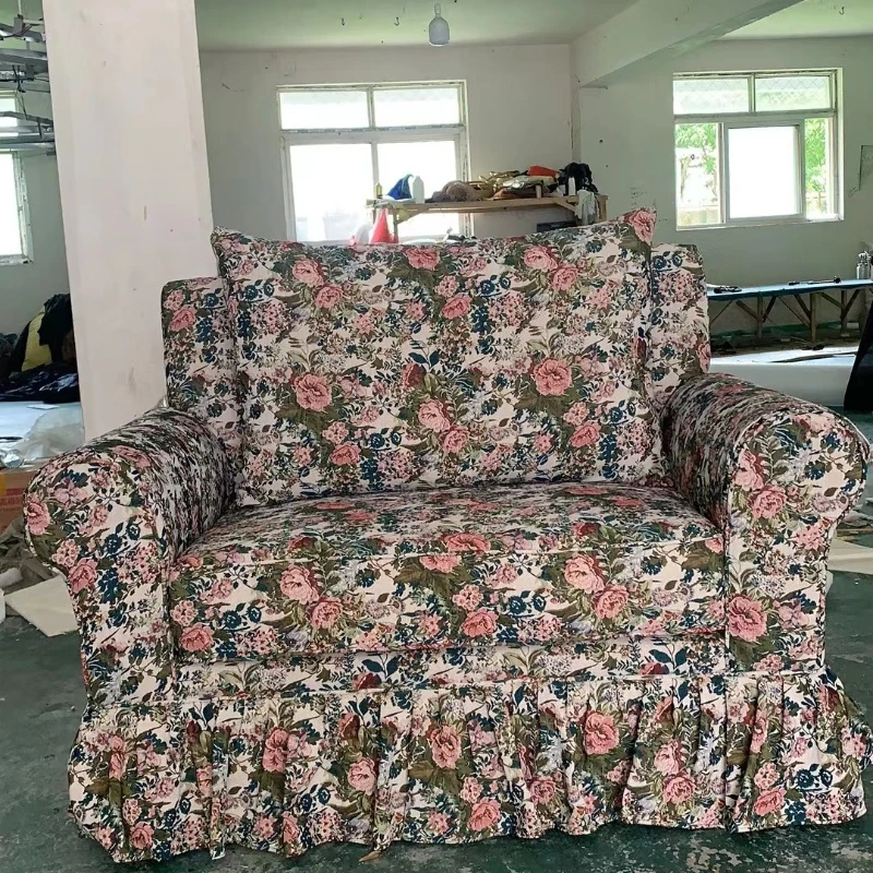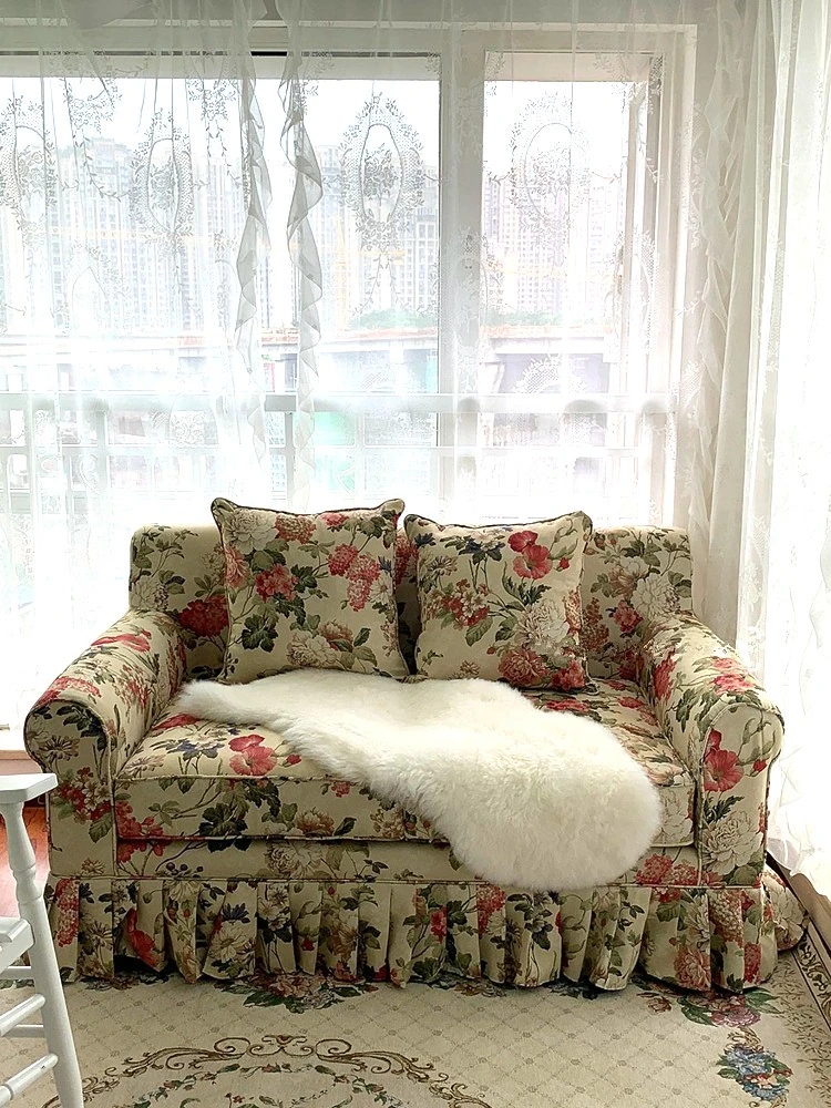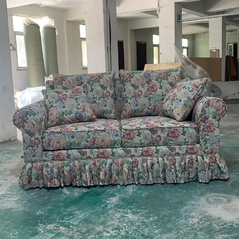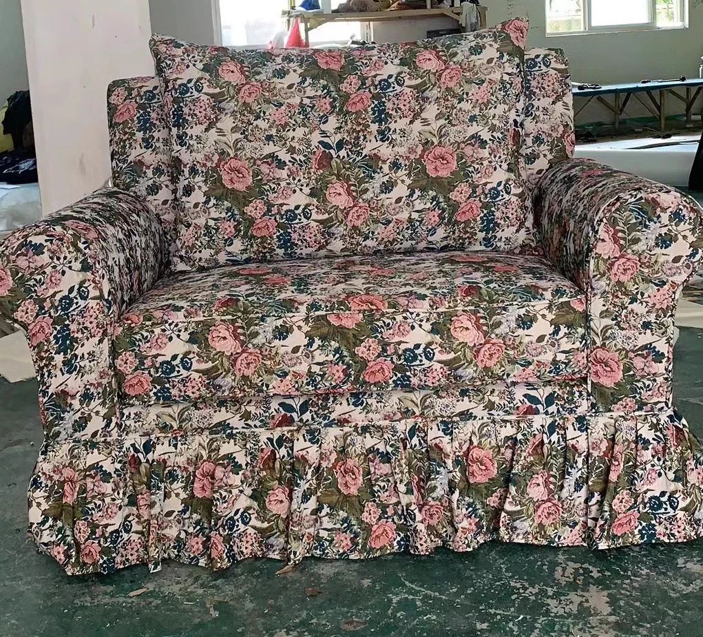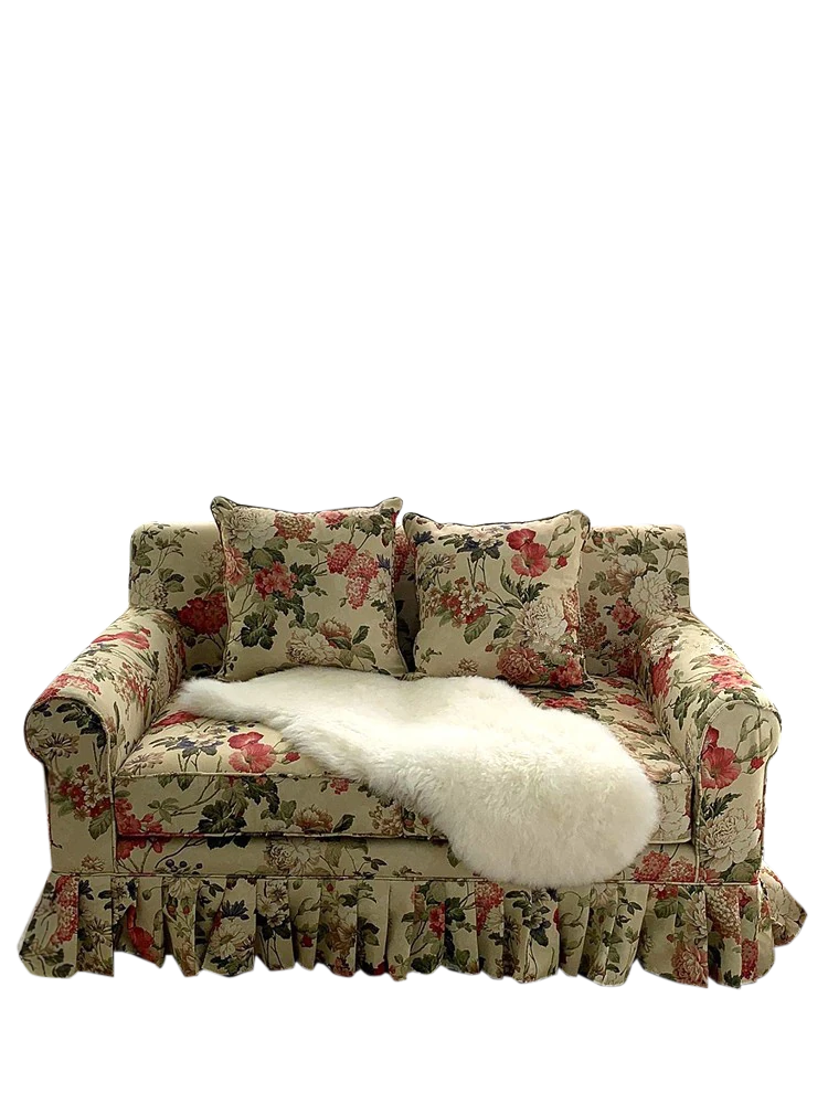 レトロアメリカンスタイルのフレンチ田園風ダブルソファー - 小さなリビングにぴったりの花柄ファブリック中古家具。おしゃれで温かみのある空間を演出します!