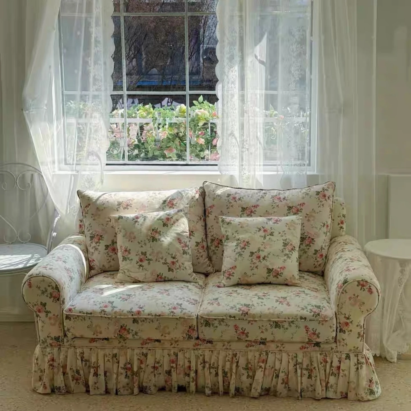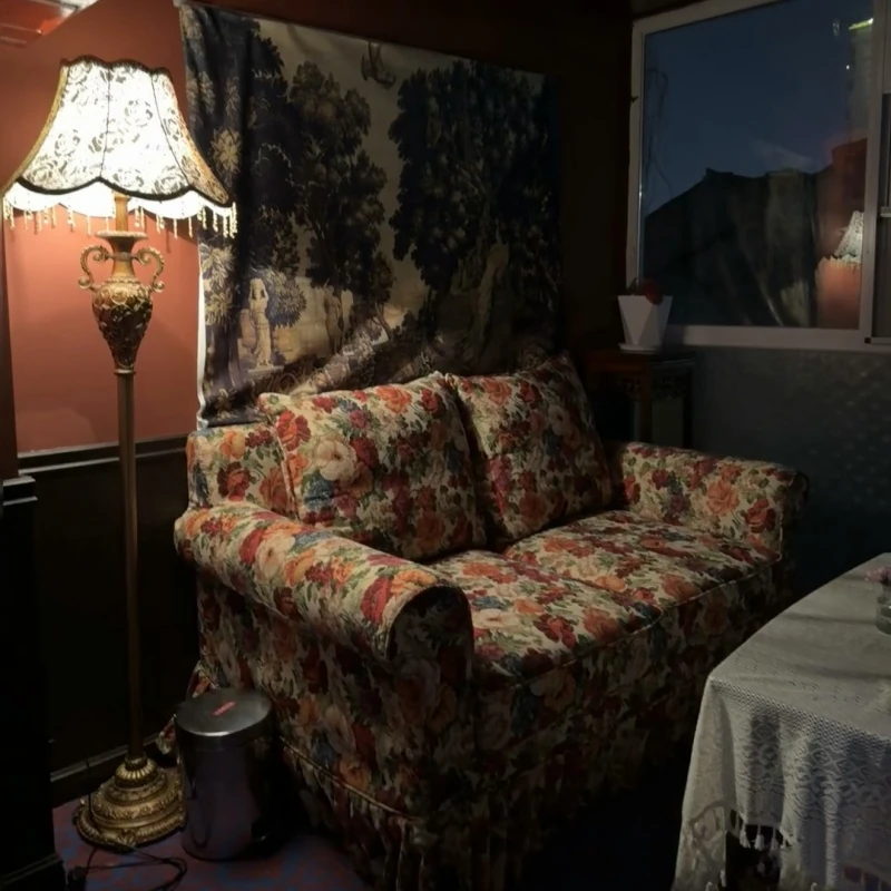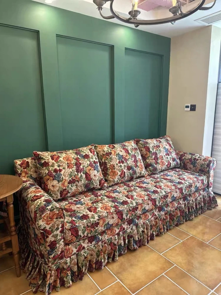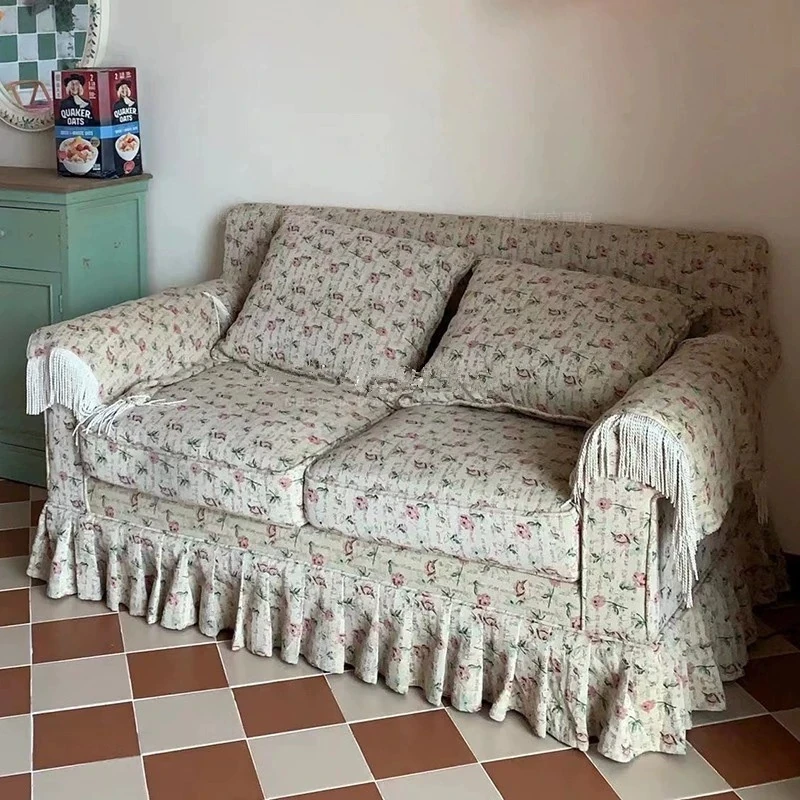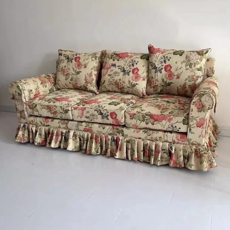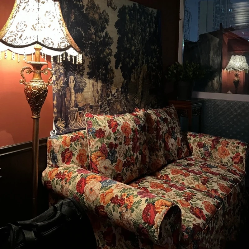 レトロアメリカンスタイルのフレンチ田園風ダブルソファー - 小さなリビングにぴったりの花柄ファブリック中古家具。おしゃれで温かみのある空間を演出します!