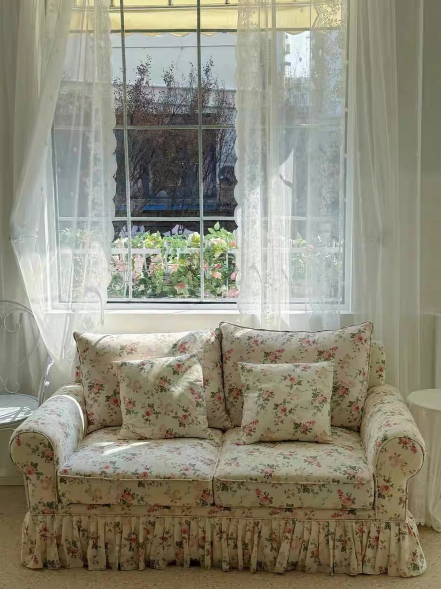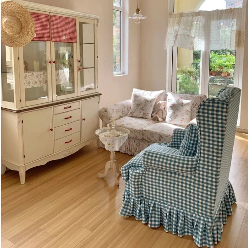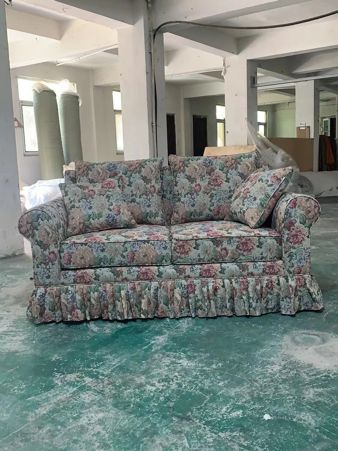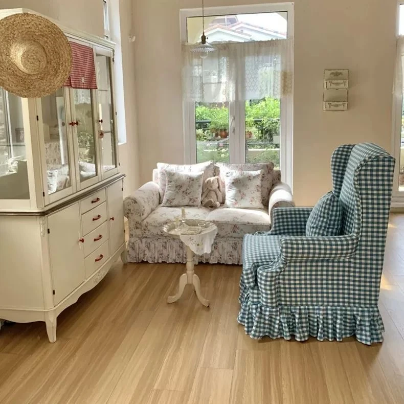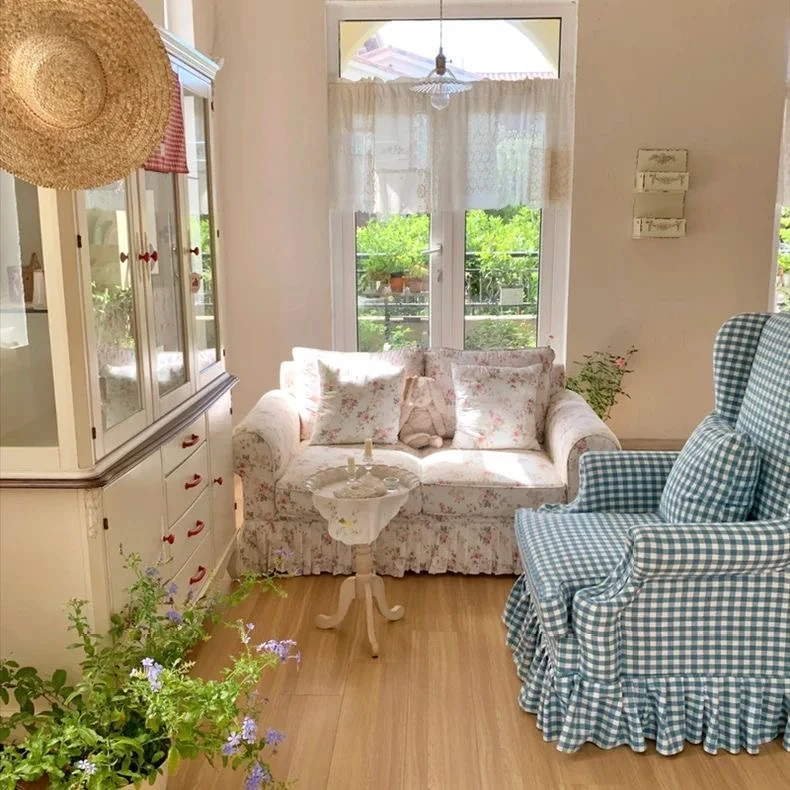 レトロアメリカンスタイルのフレンチ田園風ダブルソファー - 小さなリビングにぴったりの花柄ファブリック中古家具。おしゃれで温かみのある空間を演出します!